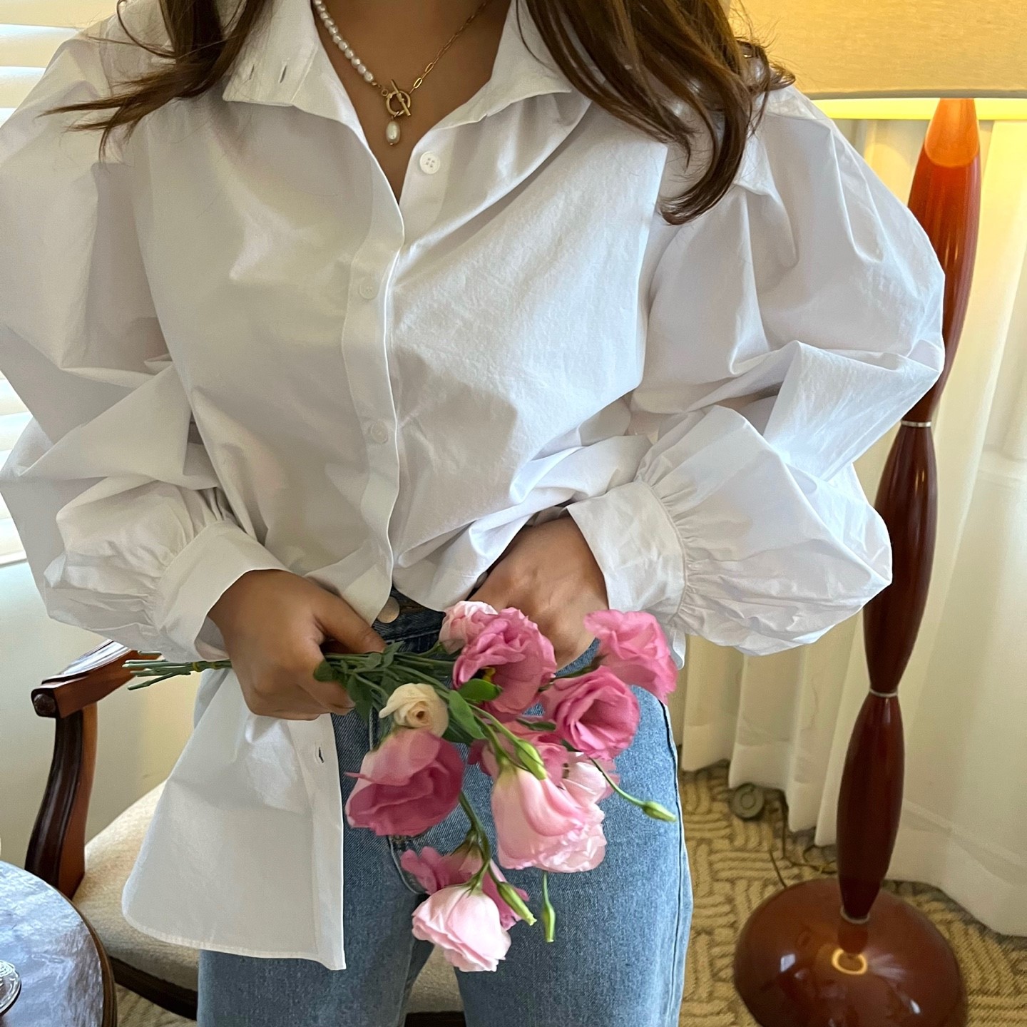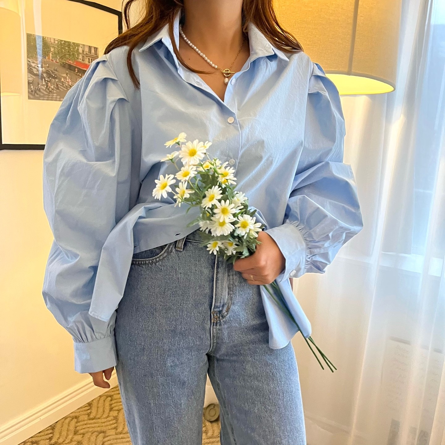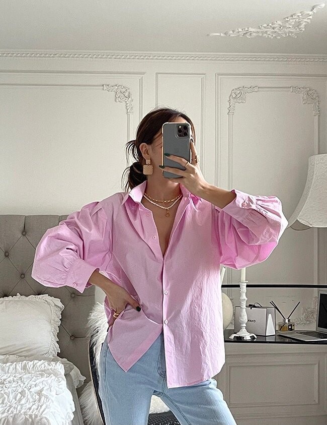品名:벌룬셔츠 ◎※☞颜色:소라, 핑크, 화이트 ◎※☞尺寸:FREE ◎※☞材质:纯棉 100% 翻译