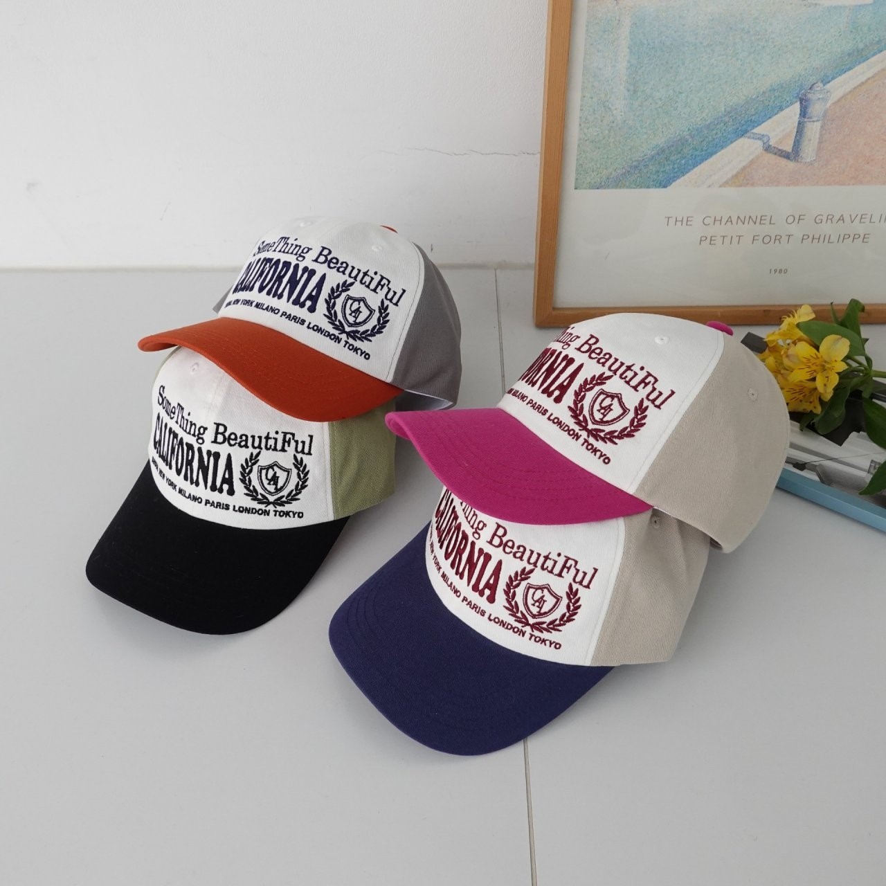 品名:신상 BC1222 캘리포니아 월계관 배색 볼캡 ◎※☞颜色:네이비, 블랙, 오렌지, 핑크 ◎※☞尺寸:F ◎※☞材质:纯棉 100% 翻译