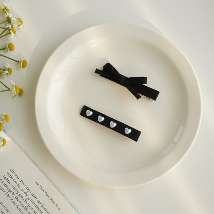 品名:H3039 하트 리본 헤어핀 세트 ◎※☞颜色:블랙 ◎※☞尺寸:F ◎※☞材质:스틸 0% 翻译