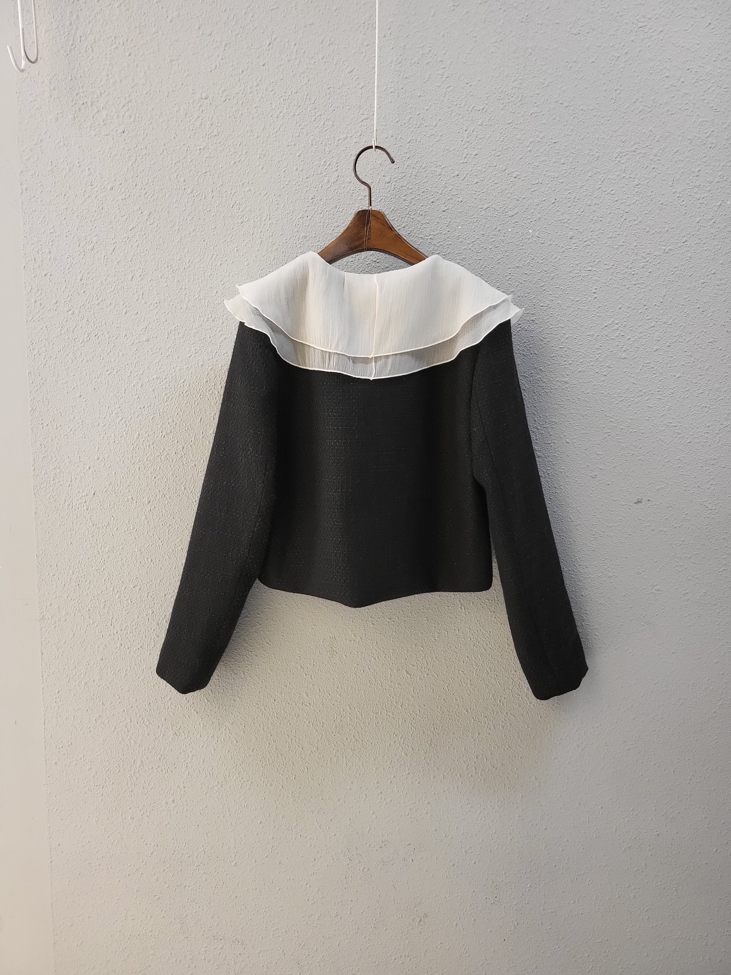 品名:프릴 배색 러블리 더블 자켓 ◎※☞颜色:블랙, 아이보리 ◎※☞尺寸:FREE ◎※☞材质:腈纶 50%,聚酯 50% ◎※☞注意事项:只能干洗,只能手洗,不能手洗,机洗,不能使用漂白剂,不能烘干,不能熨烫,不能曲折