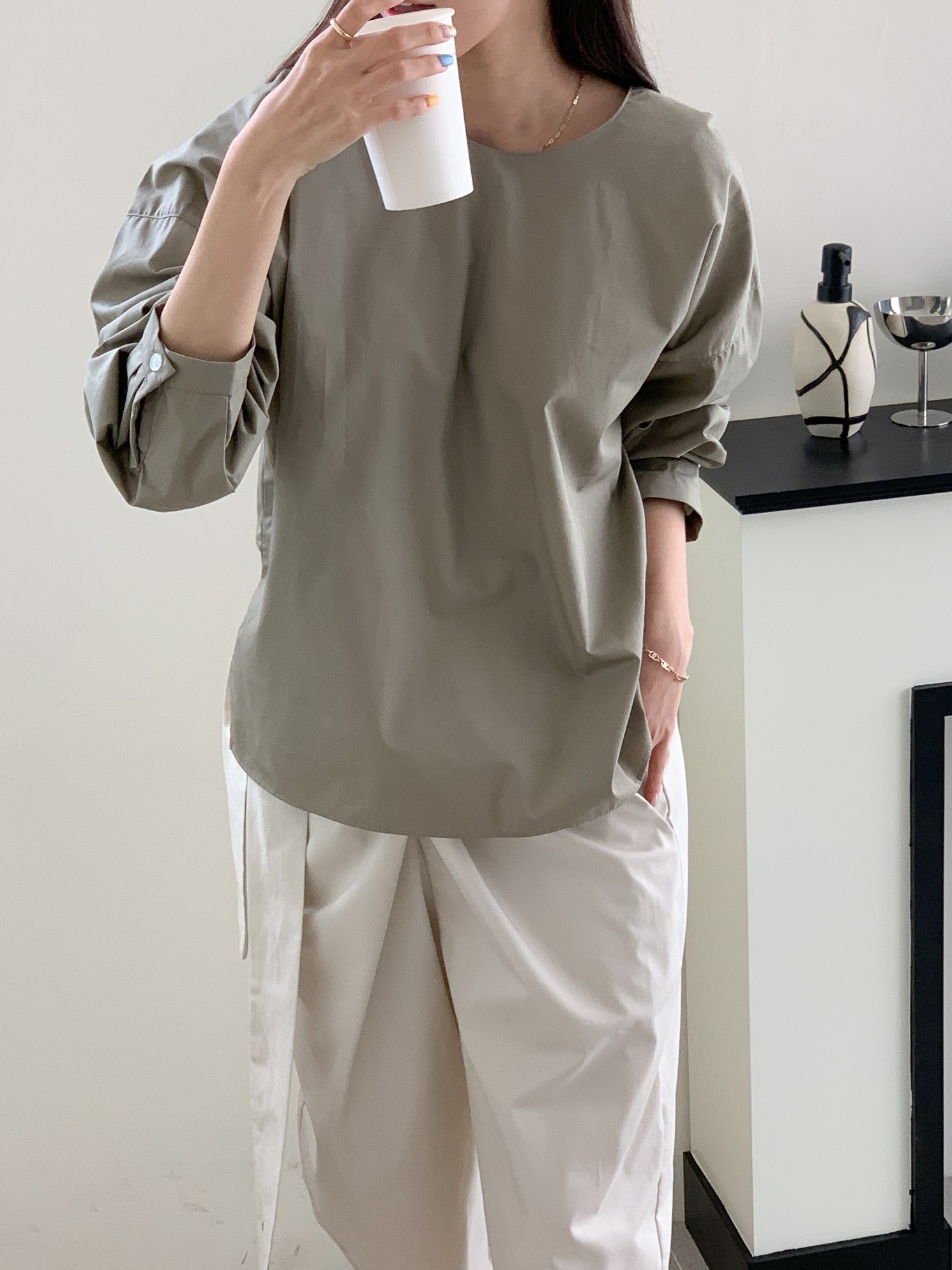 品名:简约褶皱圆领纯棉长袖衬衫 ◎※☞颜色:카키, 크림 ◎※☞尺寸:FREE ◎※☞材质:纯棉 100% ◎※☞注意事项:只能干洗,只能手洗,不能手洗,机洗,不能使用漂白剂,不能烘干,不能熨烫,不能曲折 翻译