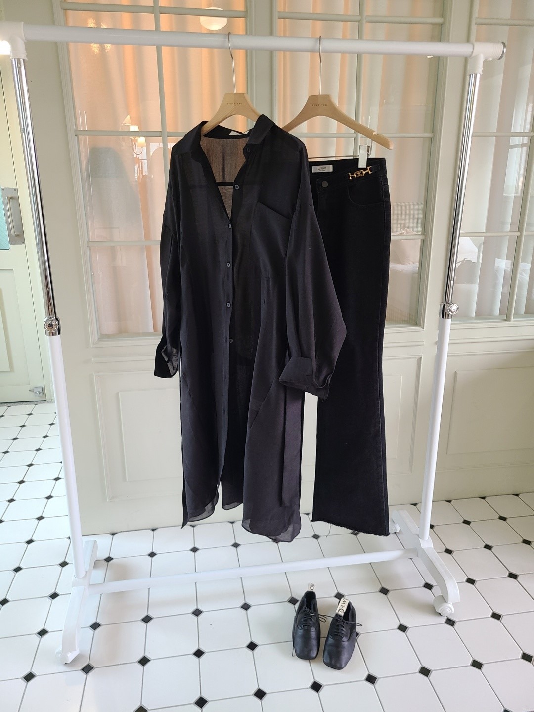 品名:베라롱셔츠 ◎※☞颜色:블랙, 블루, 화이트 ◎※☞尺寸:FREE ◎※☞材质:聚酯 21%,天丝 79% 翻译