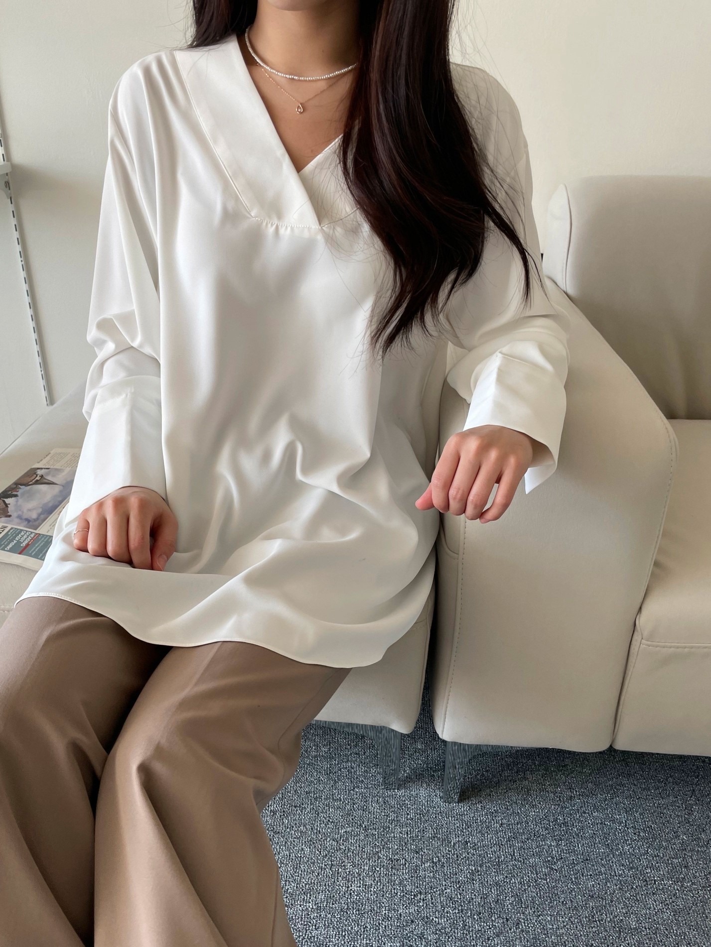 品名:简约纯色V领宽松衬衫上衣 ◎※☞颜色:블랙, 피치, 화이트 ◎※☞尺寸:FREE ◎※☞材质:聚酯 100% ◎※☞注意事项:只能干洗,只能手洗,不能手洗,机洗,不能使用漂白剂,不能烘干,不能熨烫,不能曲折 翻译