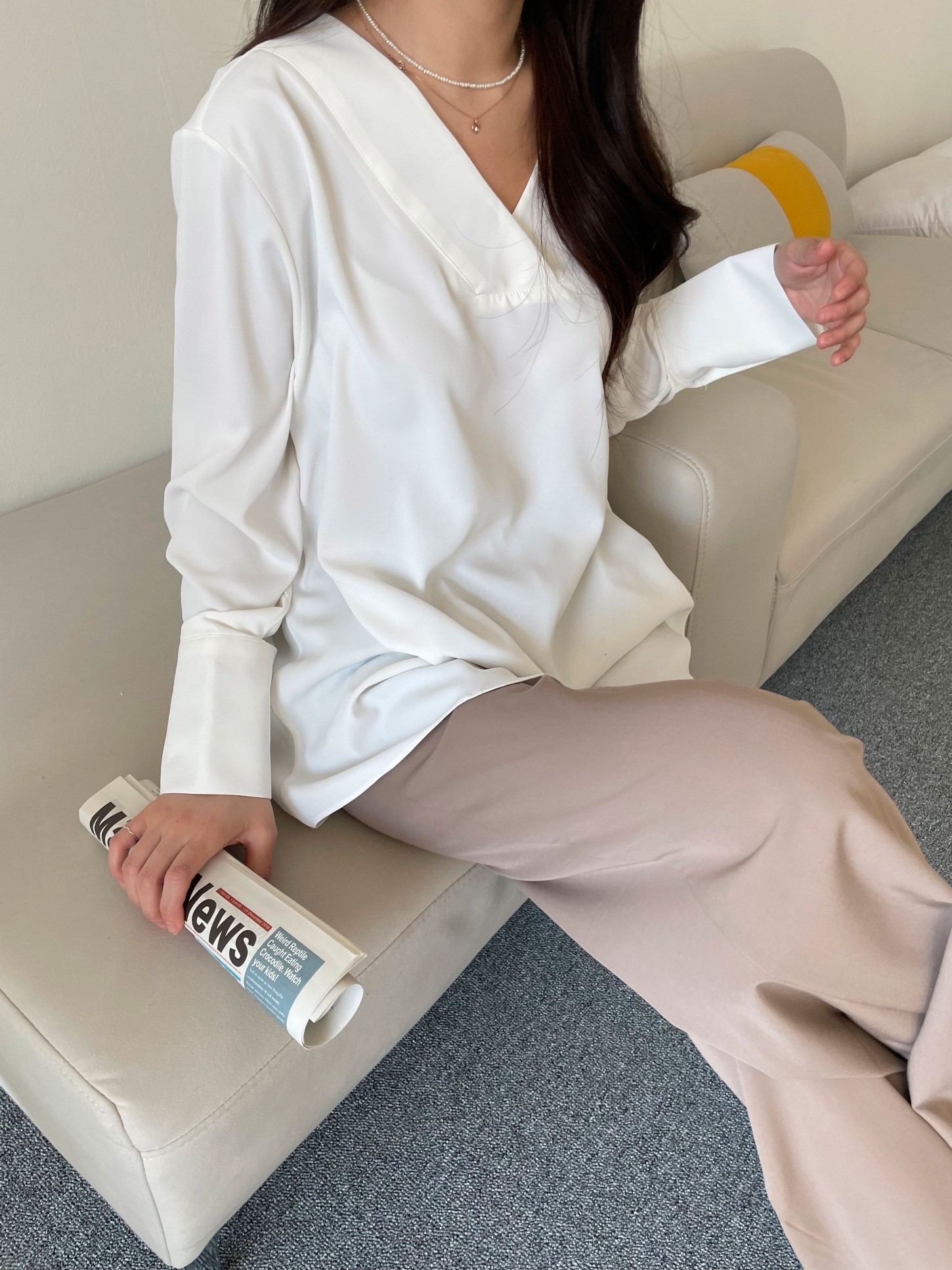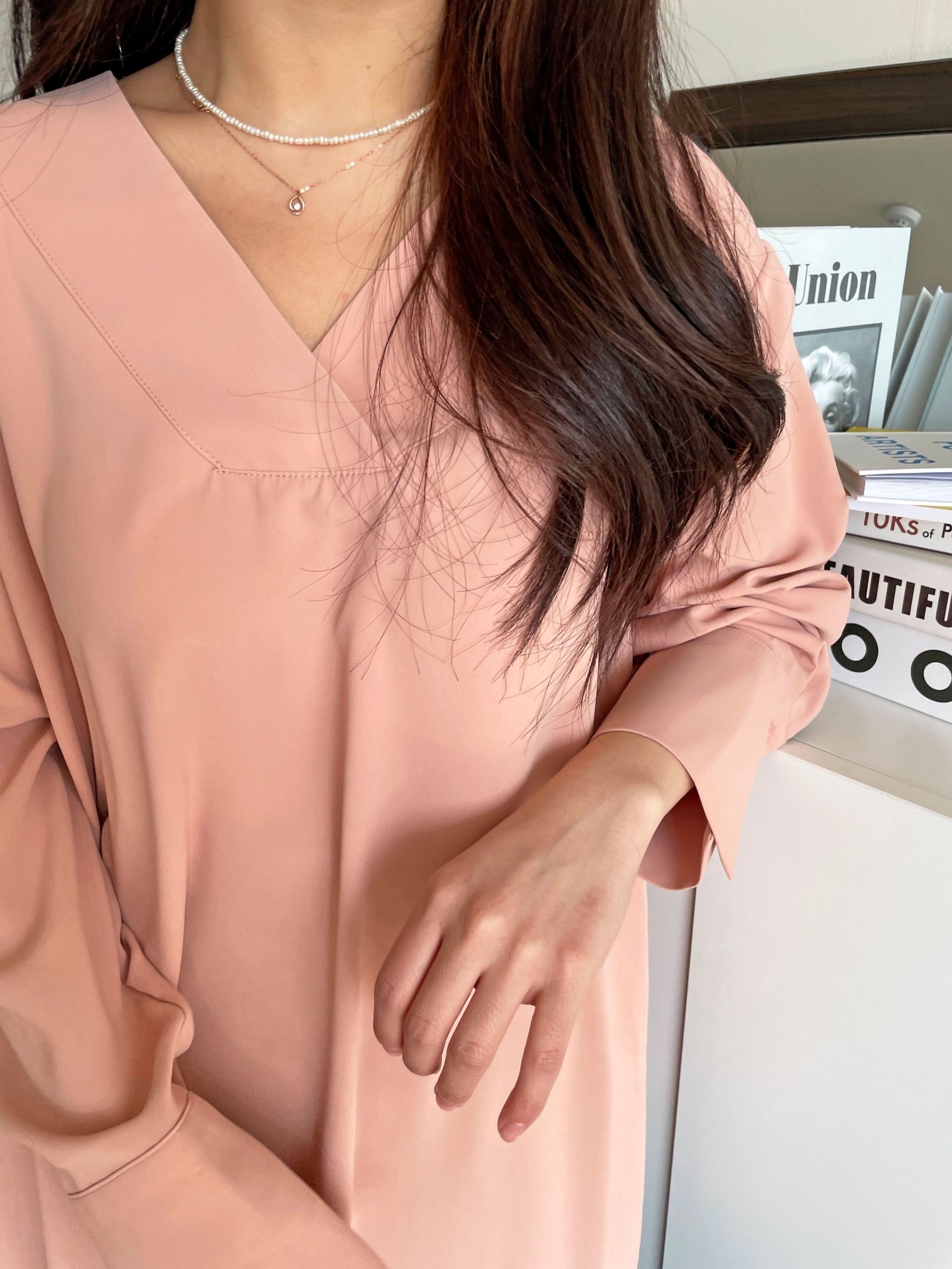 品名:纯色简约宽松V领衬衫上衣 ◎※☞颜色:블랙, 피치, 화이트 ◎※☞尺寸:FREE ◎※☞材质:聚酯 100% ◎※☞注意事项:只能干洗,只能手洗,不能手洗,机洗,不能使用漂白剂,不能烘干,不能熨烫,不能曲折 翻译