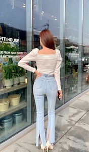 前后深邃的一字领口很减龄,肩上的小泡泡袖突显T整体的轮廓!