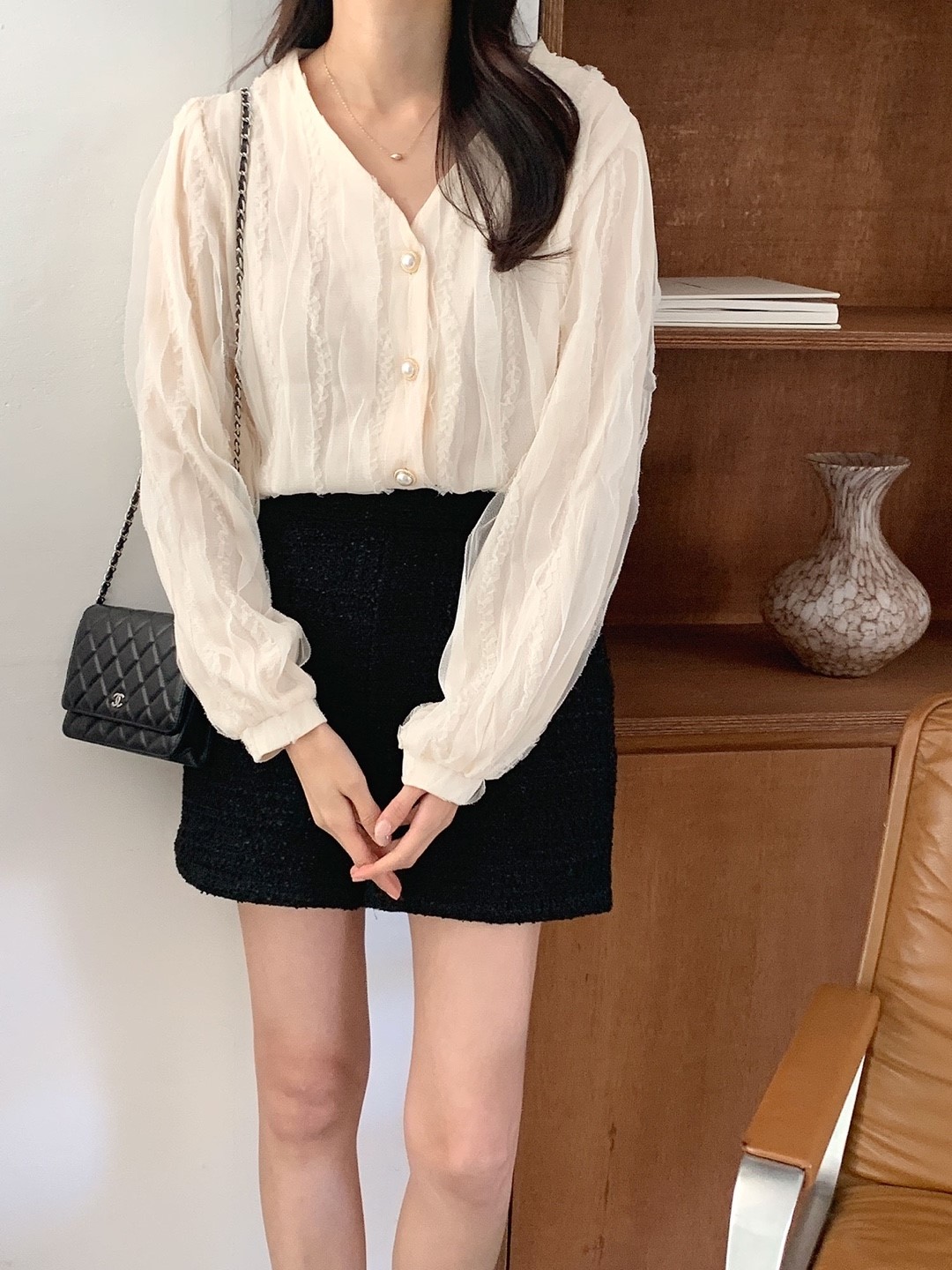 品名:프라하 블라우스 ◎※☞颜色:네이비, 베이지 ◎※☞尺寸:FREE ◎※☞材质:尼龙 98%,弹力 2% 翻译
