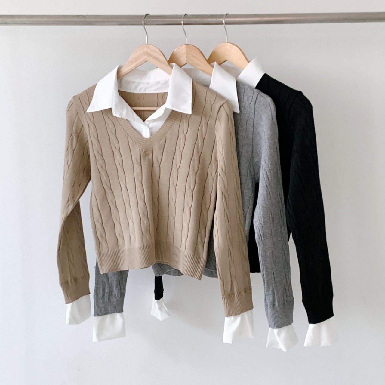 品名:로로니트(셔츠배색 꽈배기 배색 ) ◎※☞颜色:그레이, 베이지, 블랙 ◎※☞尺寸:FREE ◎※☞材质:腈纶 100% 翻译