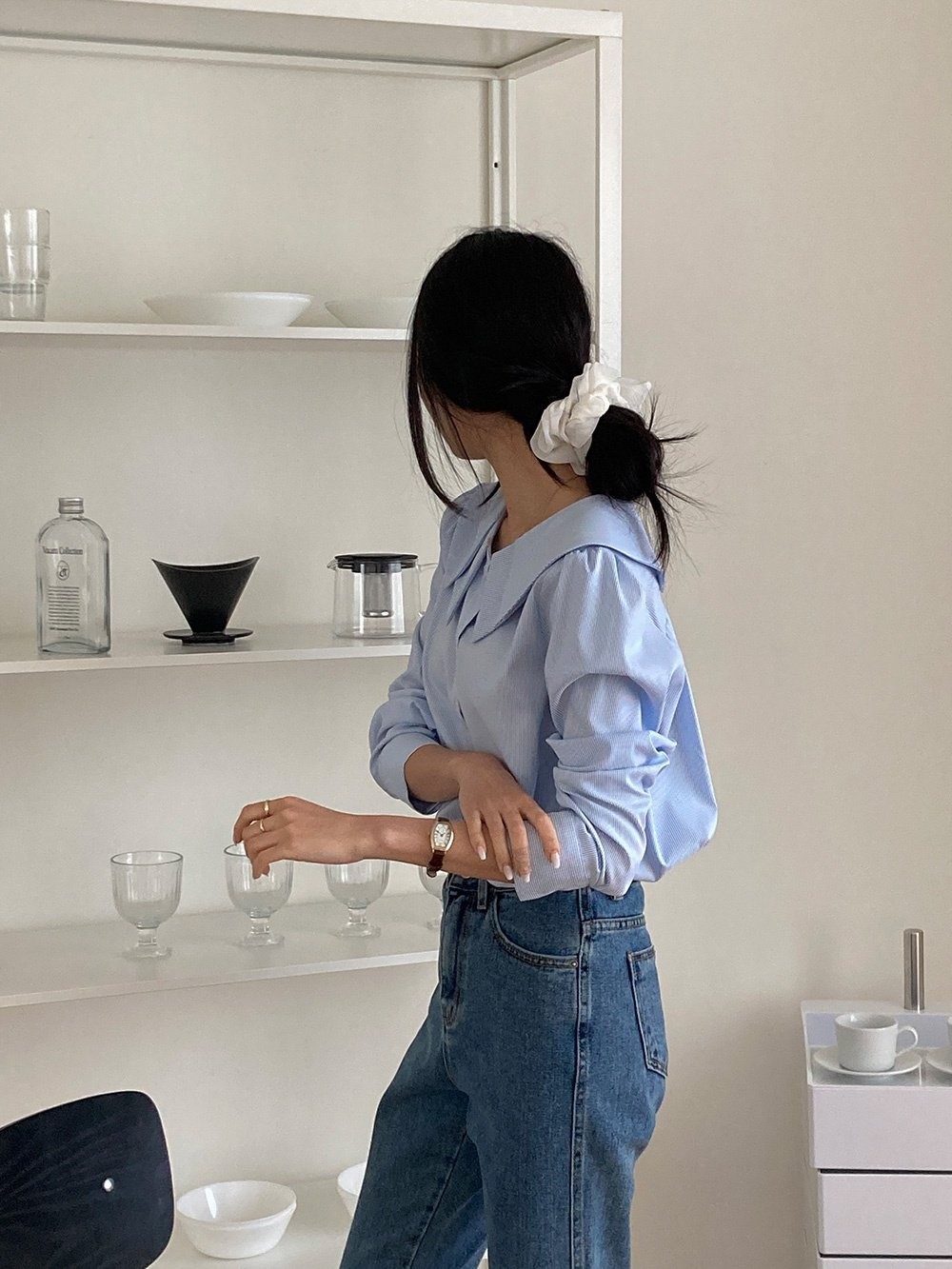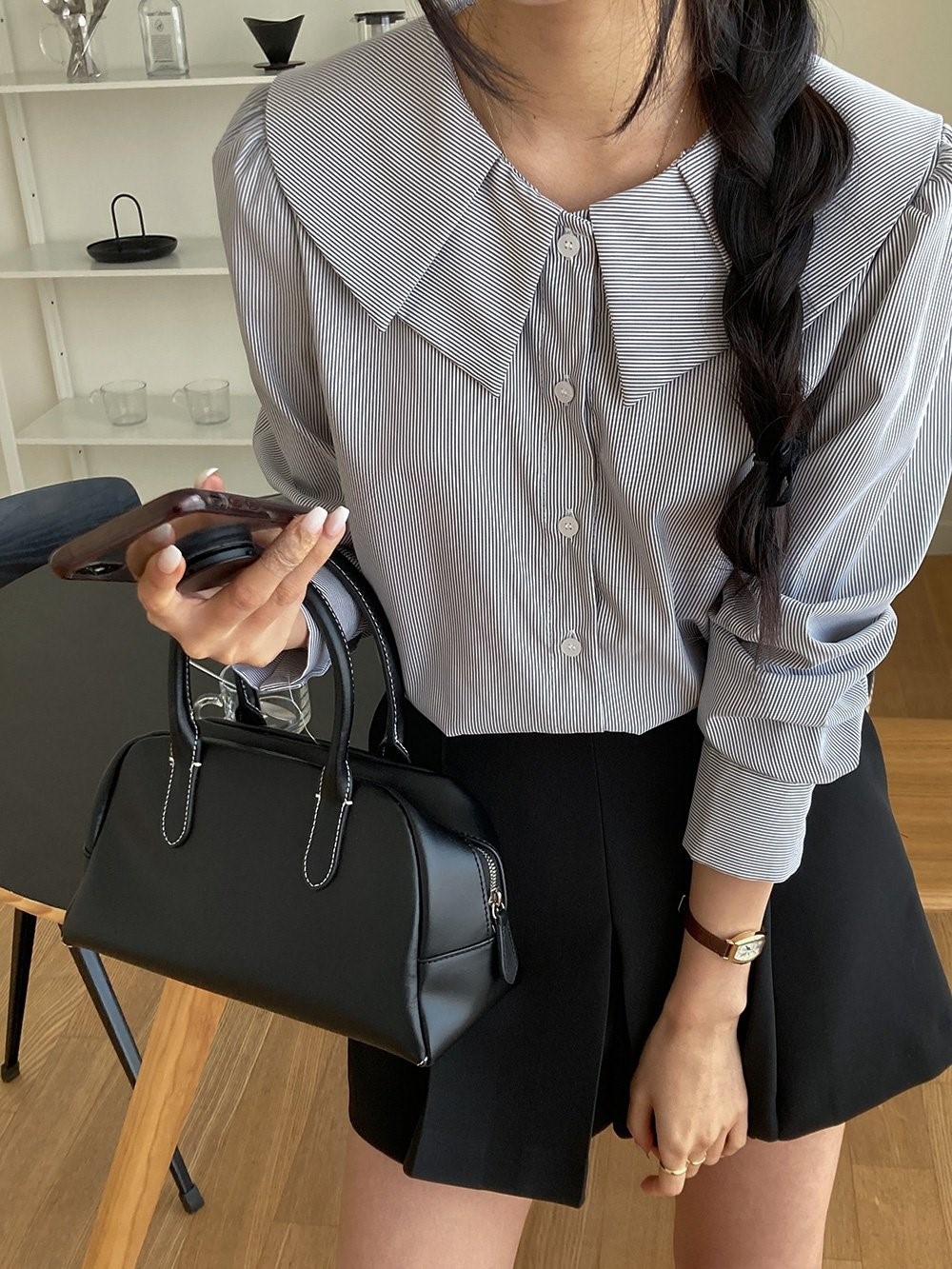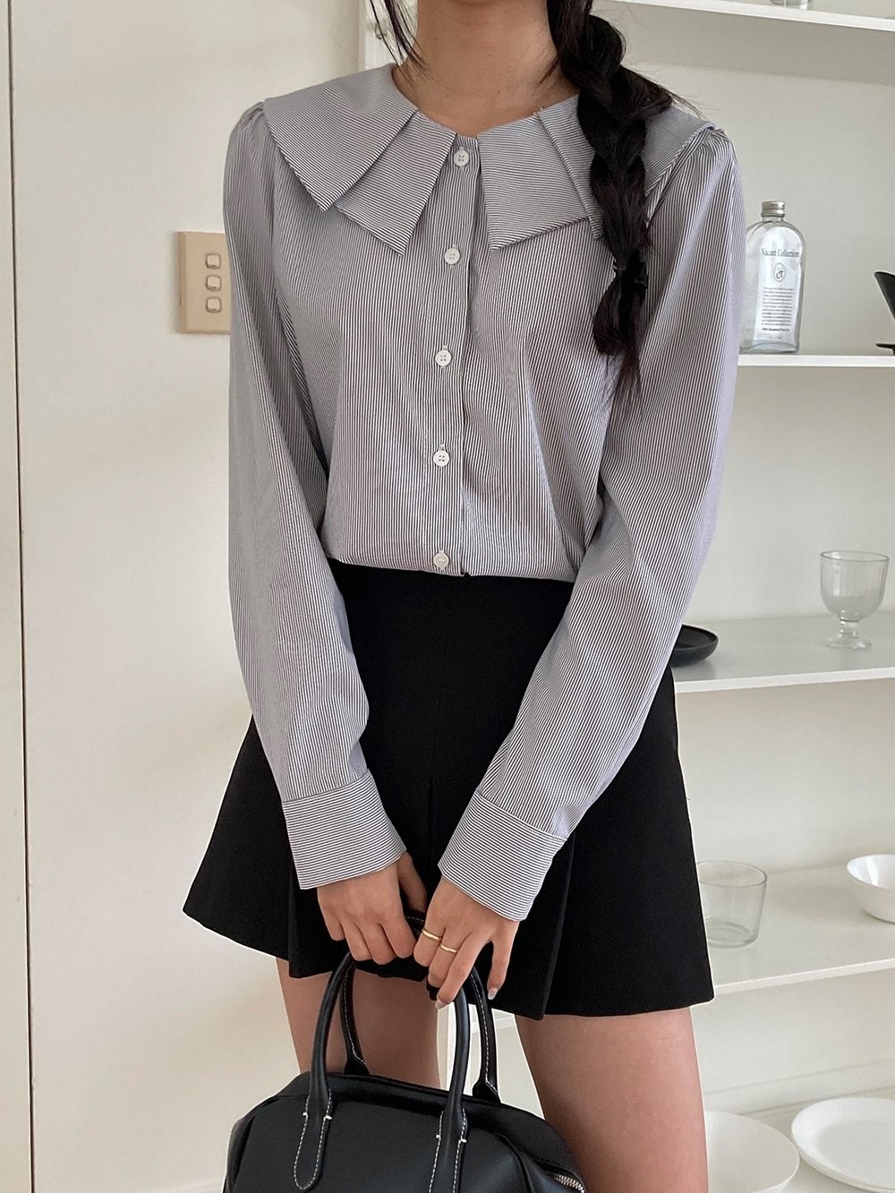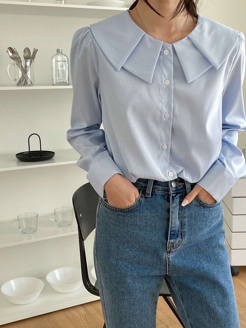 品名:이중카라스트라이프블라우스 ◎※☞颜色:블랙, 소라 ◎※☞尺寸:FREE ◎※☞材质:스판 5%,聚酯 95% 翻译