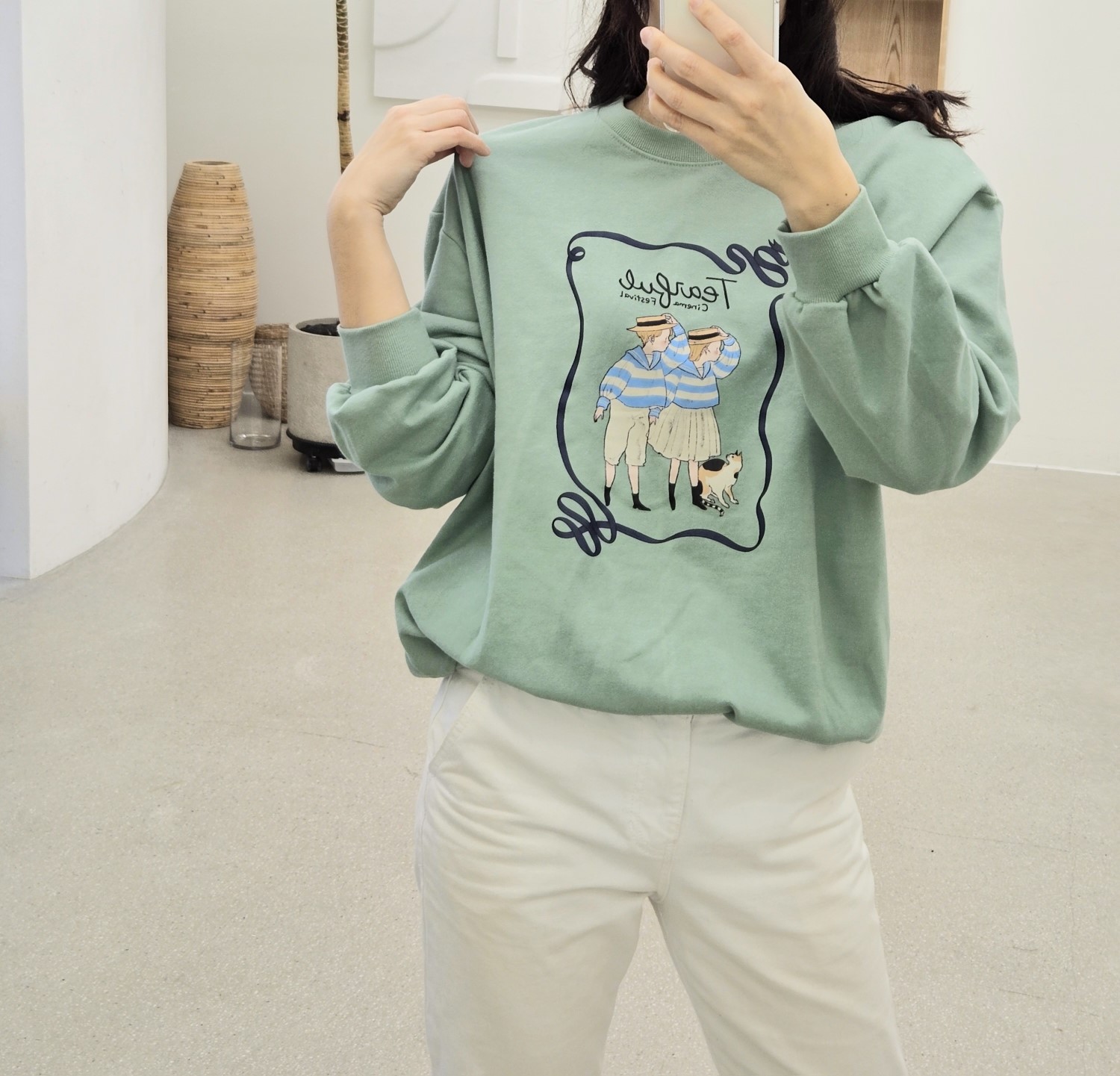 品名:주문폭주)시네마맨투맨 ◎※☞颜色:민트, 아이보리, 핑크 ◎※☞尺寸:FREE ◎※☞材质:纯棉 100% ◎※☞注意事项:只能干洗,只能手洗,不能手洗,机洗,不能使用漂白剂,不能烘干,不能熨烫,不能曲折 翻译