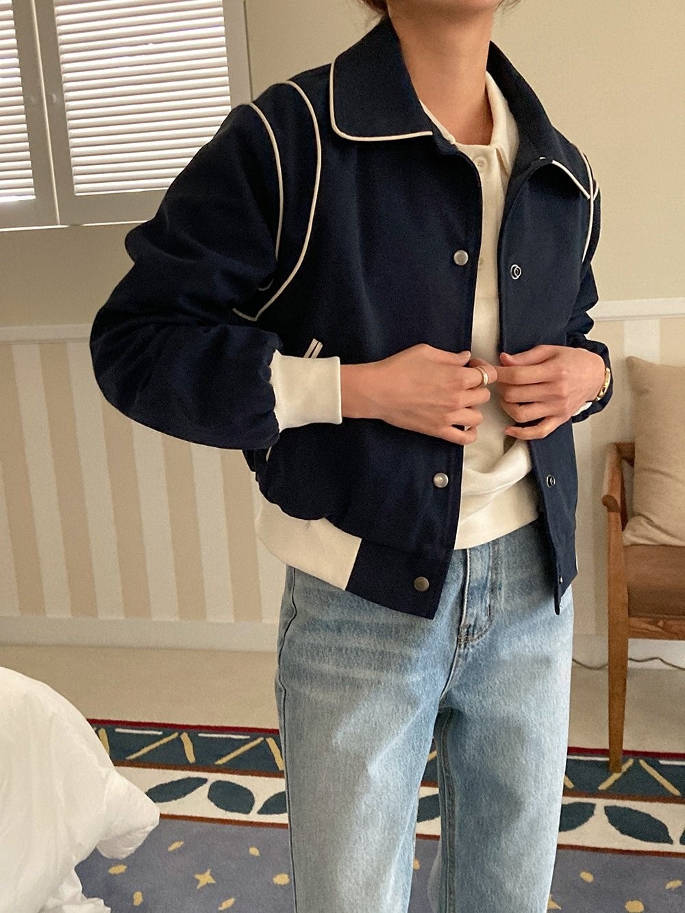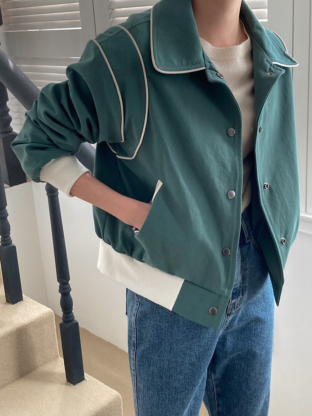 品名:코튼파이핑자켓 ◎※☞颜色:그린, 네이비, 베이지 ◎※☞尺寸:FREE ◎※☞材质:纯棉 100% 翻译