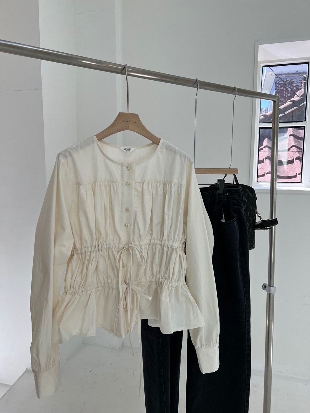 品名:무이블라우스 ◎※☞颜色:블랙, 아이보리 ◎※☞尺寸:FREE ◎※☞材质:纯棉 100% 翻译