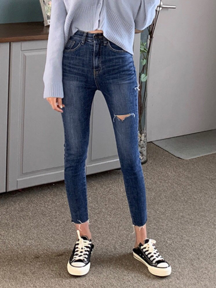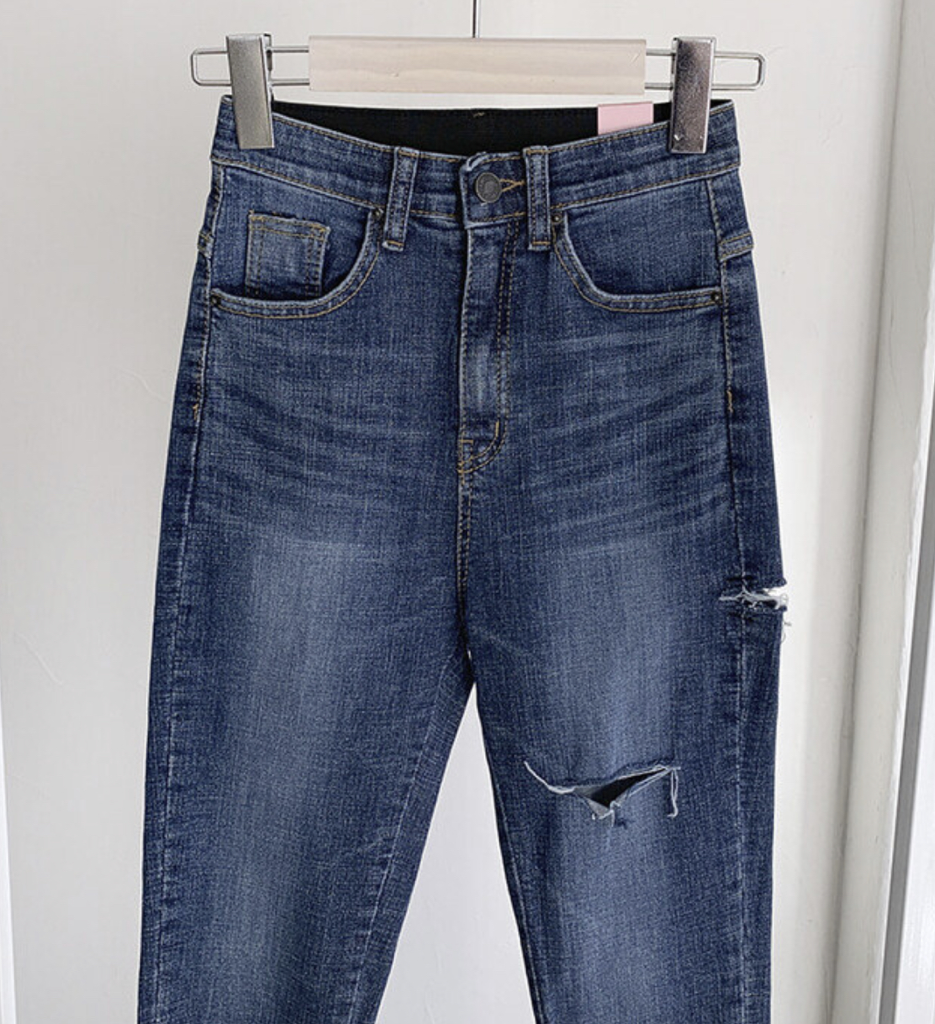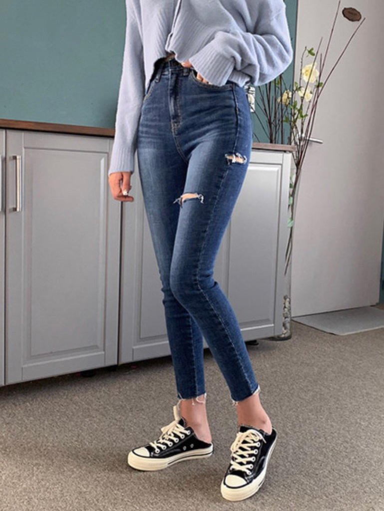 品名:#주문폭주#밴딩#쫀쫀핏#하이웨스트#글램#터치#칼구제#스키니 ◎※☞颜色:진청 ◎※☞尺寸:L, M, S ◎※☞材质:纯棉 98%,弹力 2% 翻译