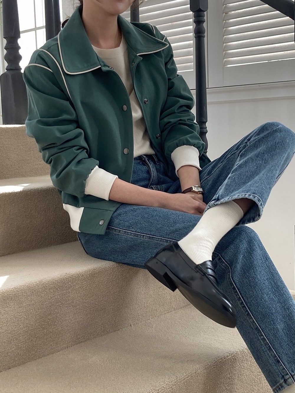 品名:코튼파이핑자켓 ◎※☞颜色:그린, 네이비, 베이지 ◎※☞尺寸:FREE ◎※☞材质:纯棉 100% 翻译