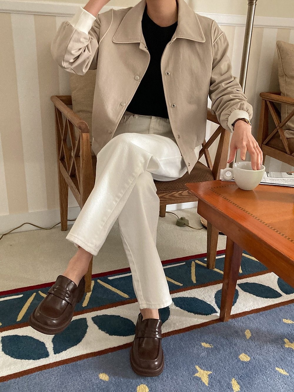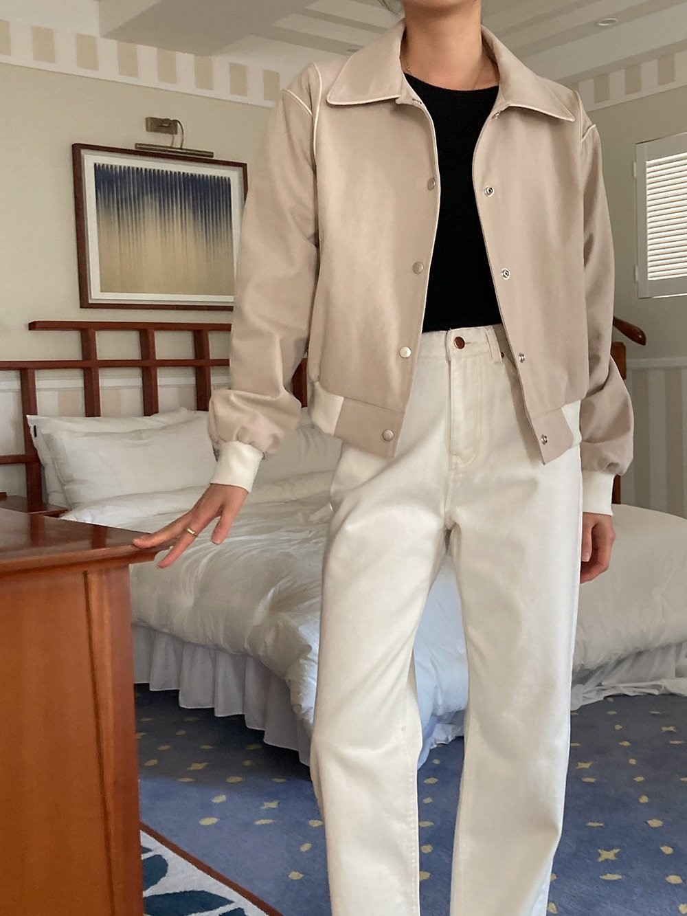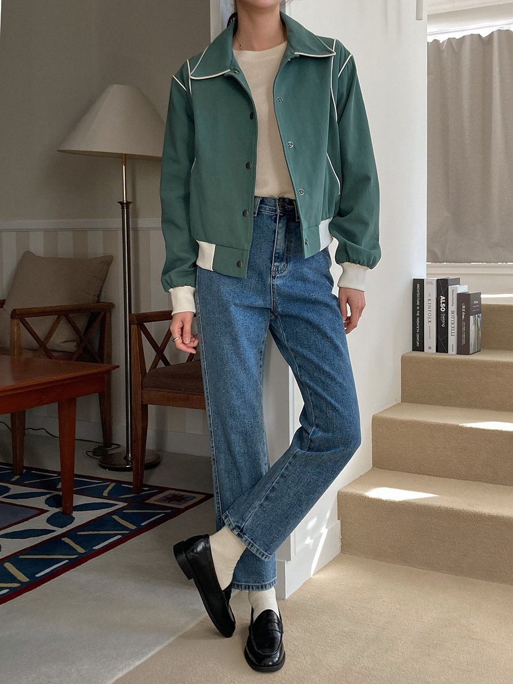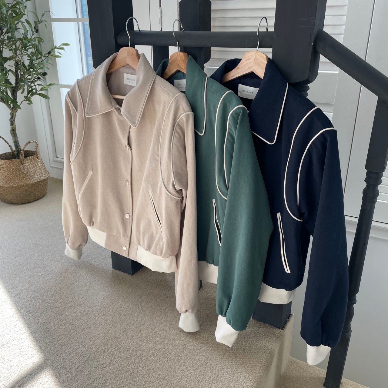 品名:코튼파이핑자켓 ◎※☞颜色:그린, 네이비, 베이지 ◎※☞尺寸:FREE ◎※☞材质:纯棉 100% 翻译