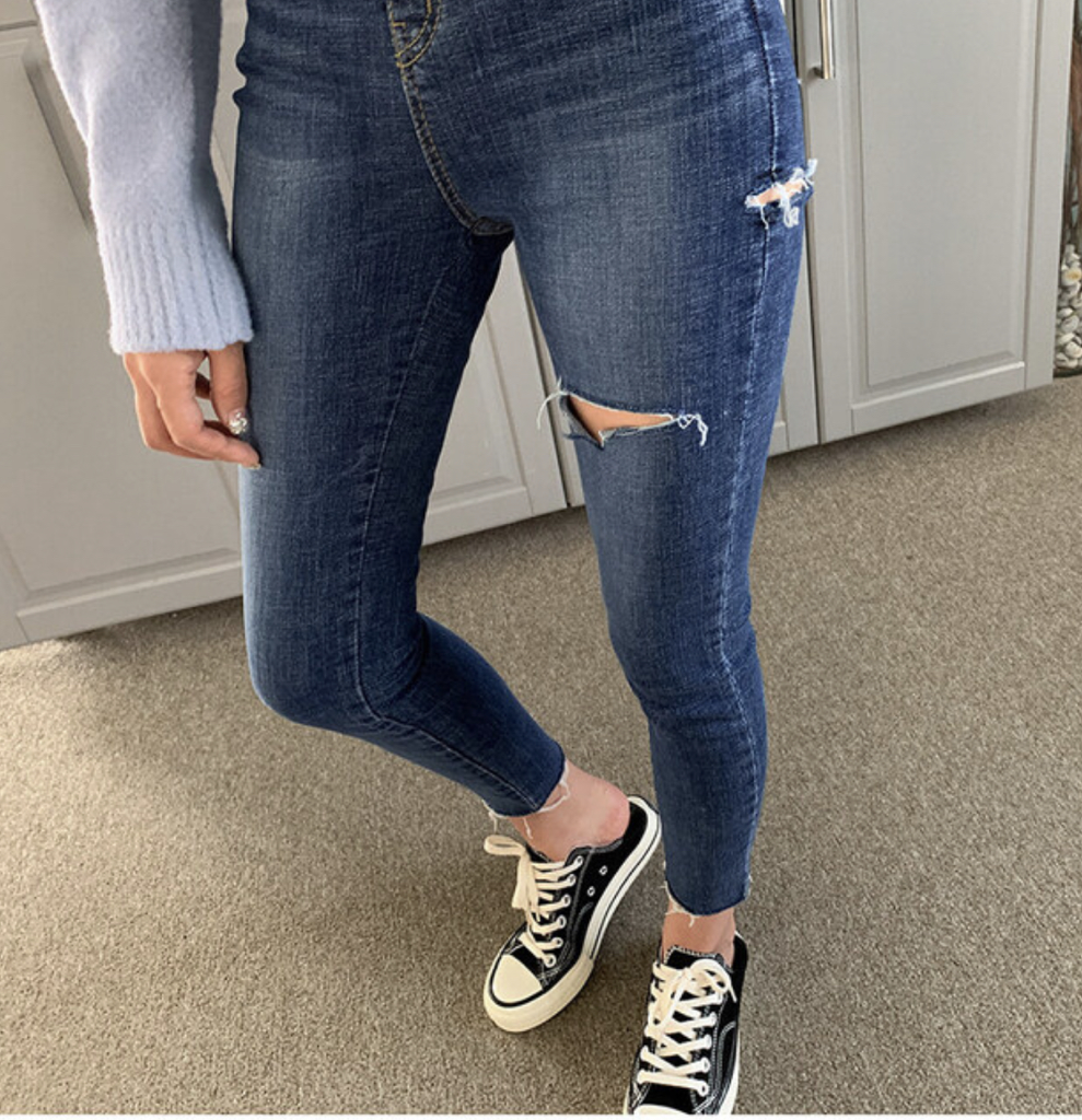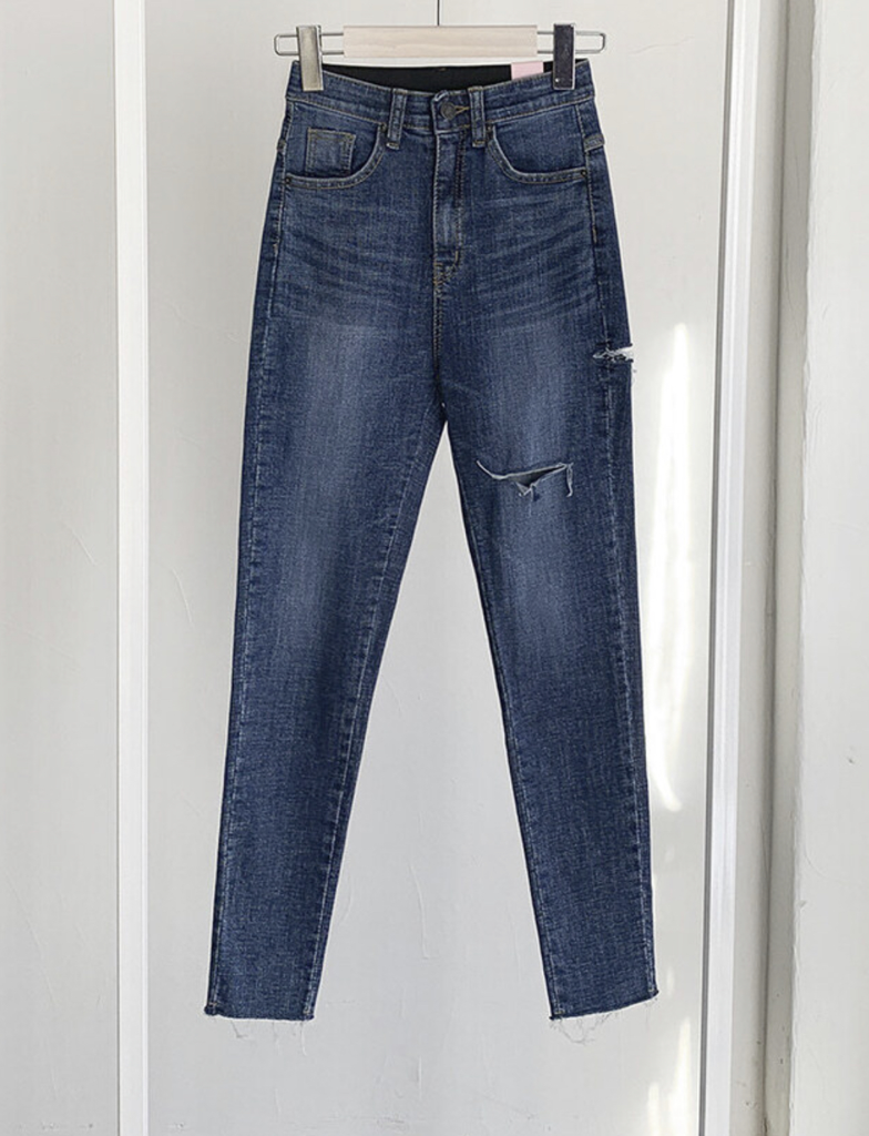 品名:#주문폭주#밴딩#쫀쫀핏#하이웨스트#글램#터치#칼구제#스키니 ◎※☞颜色:진청 ◎※☞尺寸:L, M, S ◎※☞材质:纯棉 98%,弹力 2% 翻译
