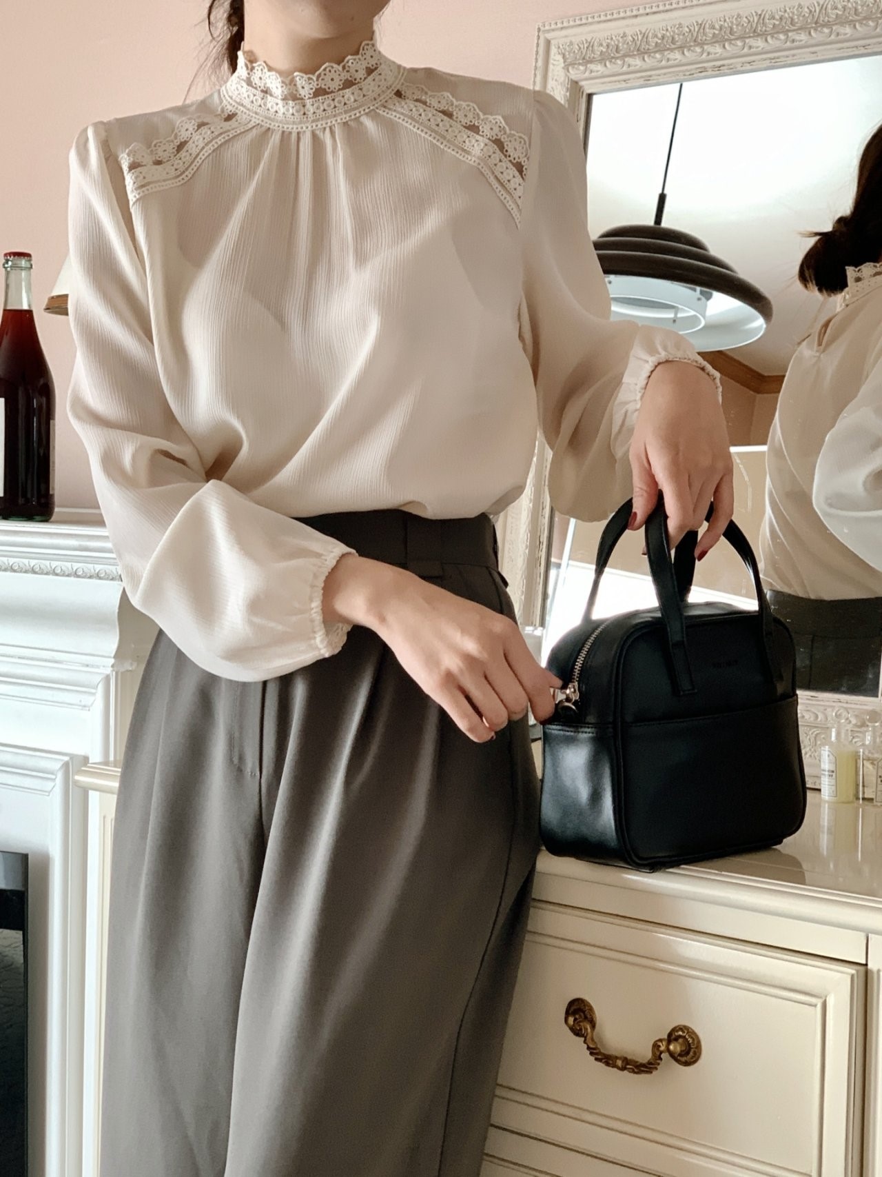 品名:바니엘블라우스(레이스 밴드 신상 ) ◎※☞颜色:베이지, 블랙 ◎※☞尺寸:FREE ◎※☞材质:聚酯 100% 翻译