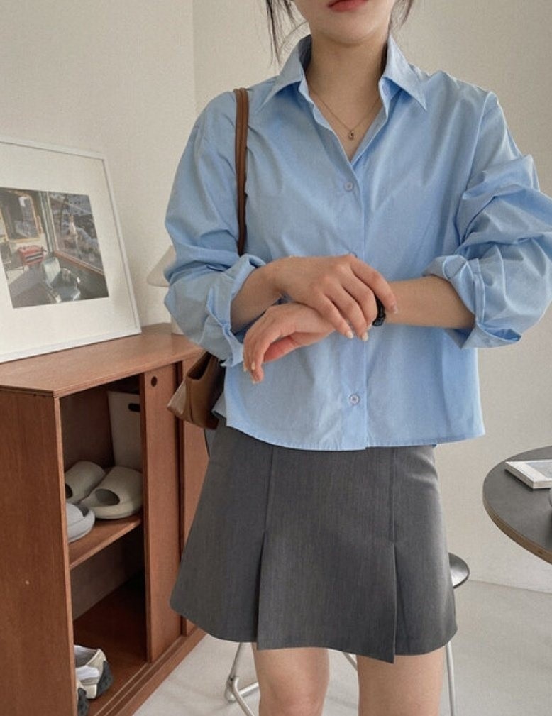 品名:크롭셔츠 ◎※☞颜色:검정, 곤색, 베이지, 브라운, 소라, 아이, 핑크 ◎※☞尺寸:FREE ◎※☞材质:纯棉 100% 翻译