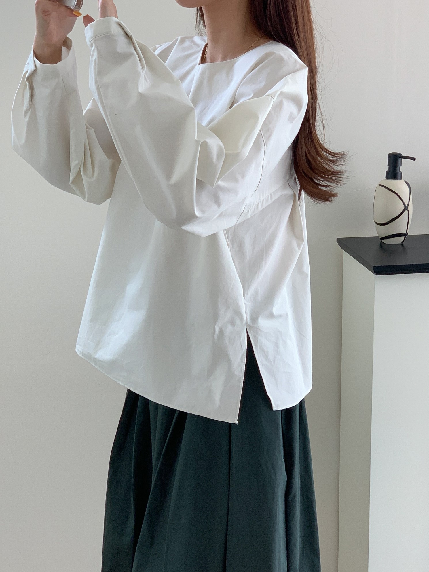 品名:简约褶皱圆领纯棉长袖衬衫 ◎※☞颜色:카키, 크림 ◎※☞尺寸:FREE ◎※☞材质:纯棉 100% ◎※☞注意事项:只能干洗,只能手洗,不能手洗,机洗,不能使用漂白剂,不能烘干,不能熨烫,不能曲折 翻译