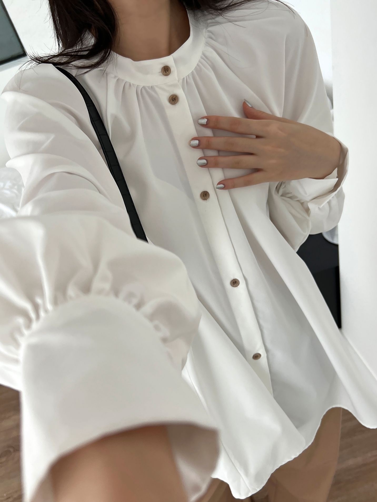 品名:纯色简约褶皱圆领衬衫上衣 ◎※☞颜色:베이지, 화이트 ◎※☞尺寸:FREE ◎※☞材质:聚酯 100% ◎※☞注意事项:只能干洗,只能手洗,不能手洗,机洗,不能使用漂白剂,不能烘干,不能熨烫,不能曲折 翻译