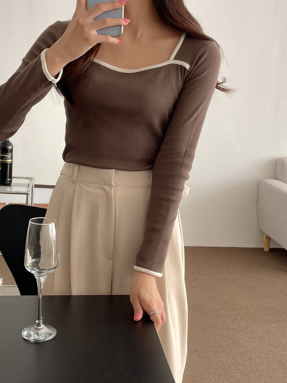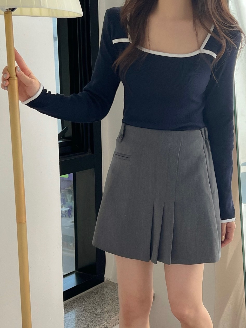 品名:요미배색T #스퀘어넥 #긴팔티 #봄 ◎※☞颜色:그레이, 네이비, 브라운, 아이보리 ◎※☞尺寸:FREE ◎※☞材质:纯棉 100% 翻译