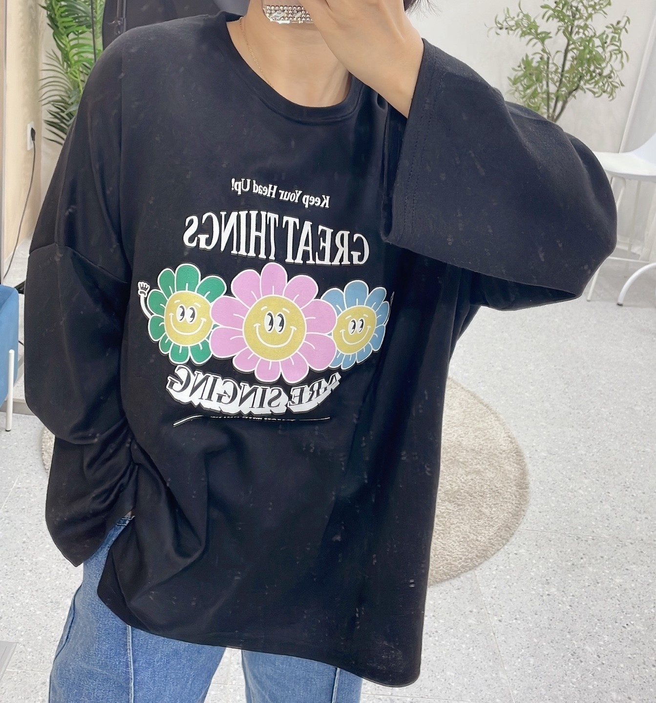品名:플라워티셔츠 #여성상의캐주얼시크로맨틱긴팔간절기봄라운드 ◎※☞颜色:블랙, 화이트 ◎※☞尺寸:FREE ◎※☞材质:纯棉 100% 翻译
