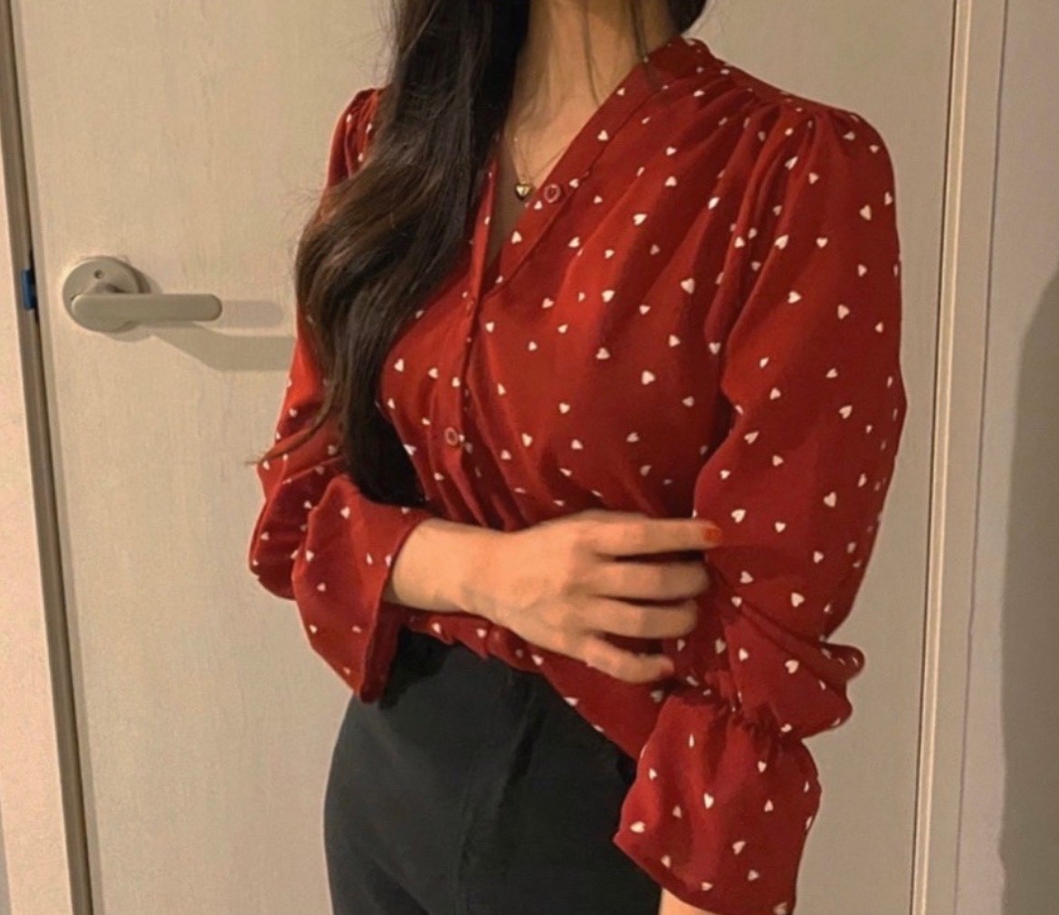 品名:세일 하트블라우스 ◎※☞颜色:레드, 블랙 ◎※☞尺寸:FREE ◎※☞材质:聚酯 100% 翻译