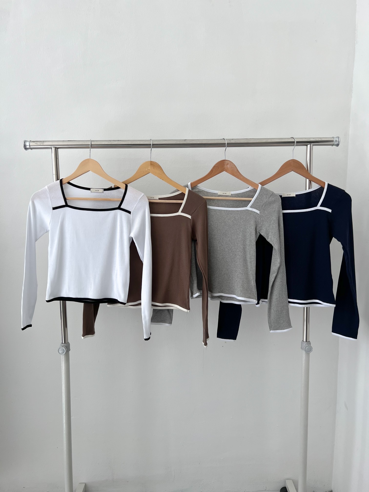 品名:요미배색T #스퀘어넥 #긴팔티 #봄 ◎※☞颜色:그레이, 네이비, 브라운, 아이보리 ◎※☞尺寸:FREE ◎※☞材质:纯棉 100% 翻译