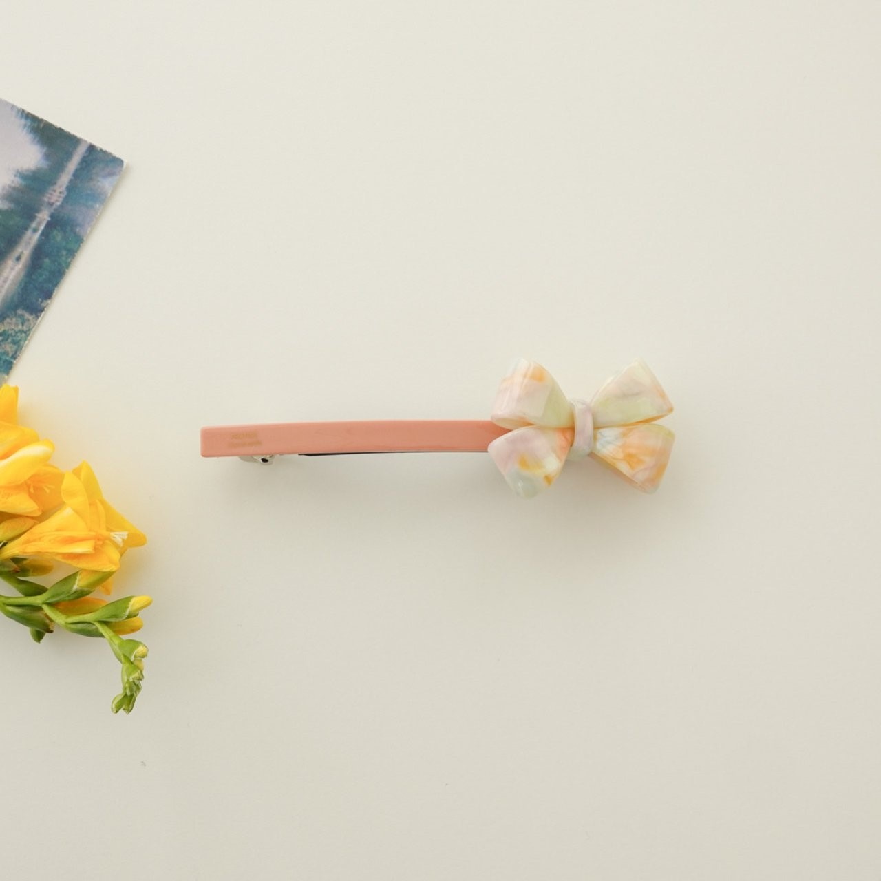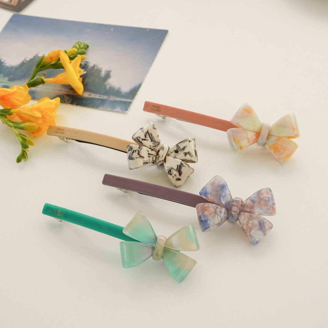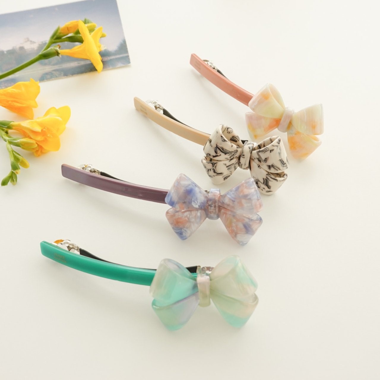 品名:H3004 셀룰로이드 리본 헤어핀 ◎※☞颜色:그린, 베이지, 오렌지, 퍼플 ◎※☞尺寸:F ◎※☞材质:腈纶 0%,스틸 0% 翻译