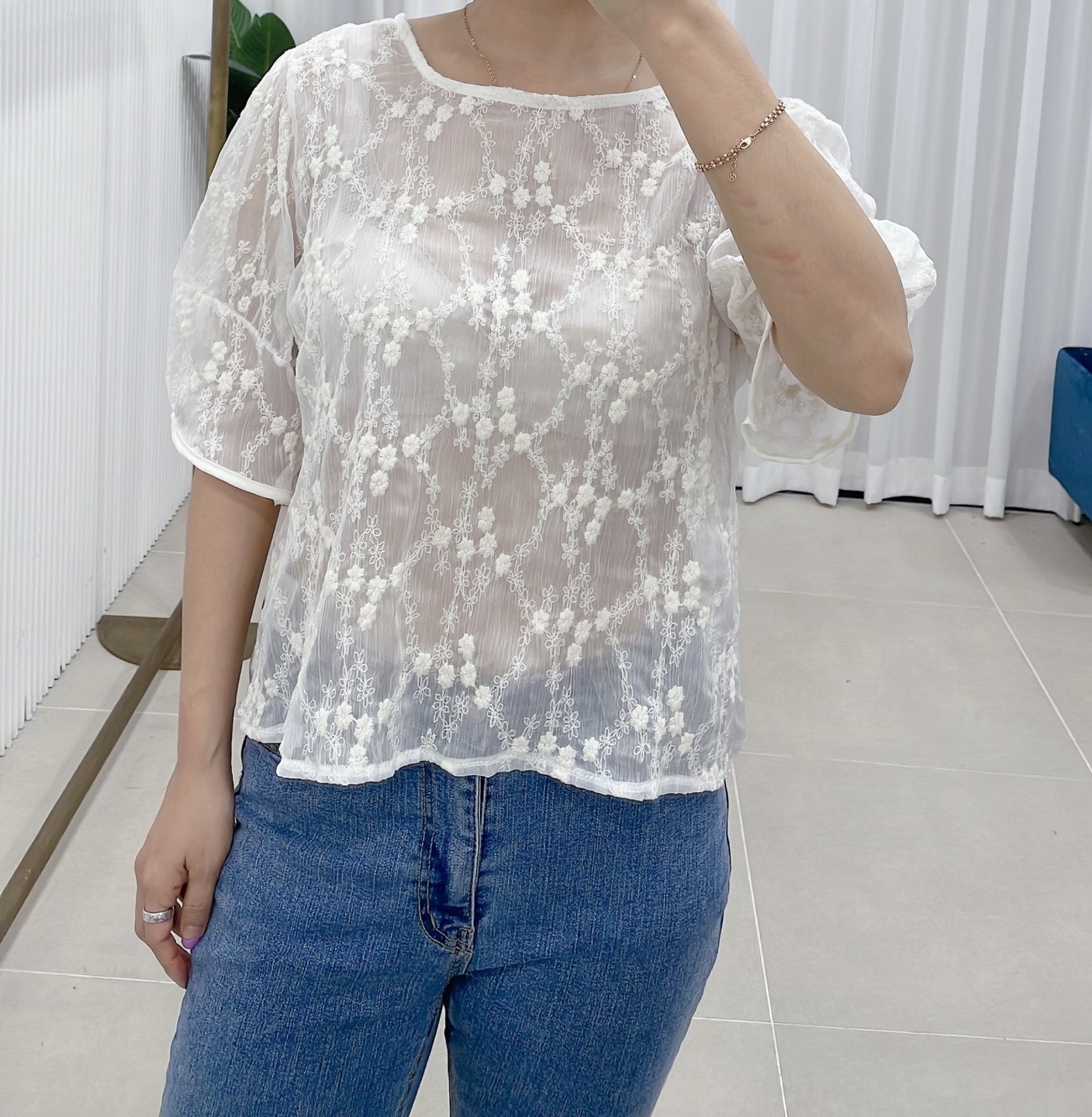 品名:세일 시스루레이스블라우스 ◎※☞颜色:베이지, 화이트 ◎※☞尺寸:FREE ◎※☞材质:聚酯 100% 翻译