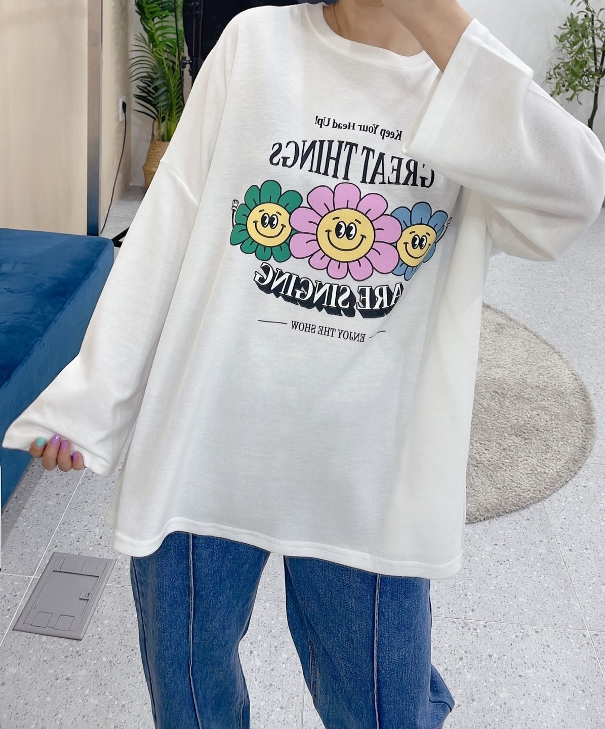 品名:플라워티셔츠 #여성상의캐주얼시크로맨틱긴팔간절기봄라운드 ◎※☞颜色:블랙, 화이트 ◎※☞尺寸:FREE ◎※☞材质:纯棉 100% 翻译