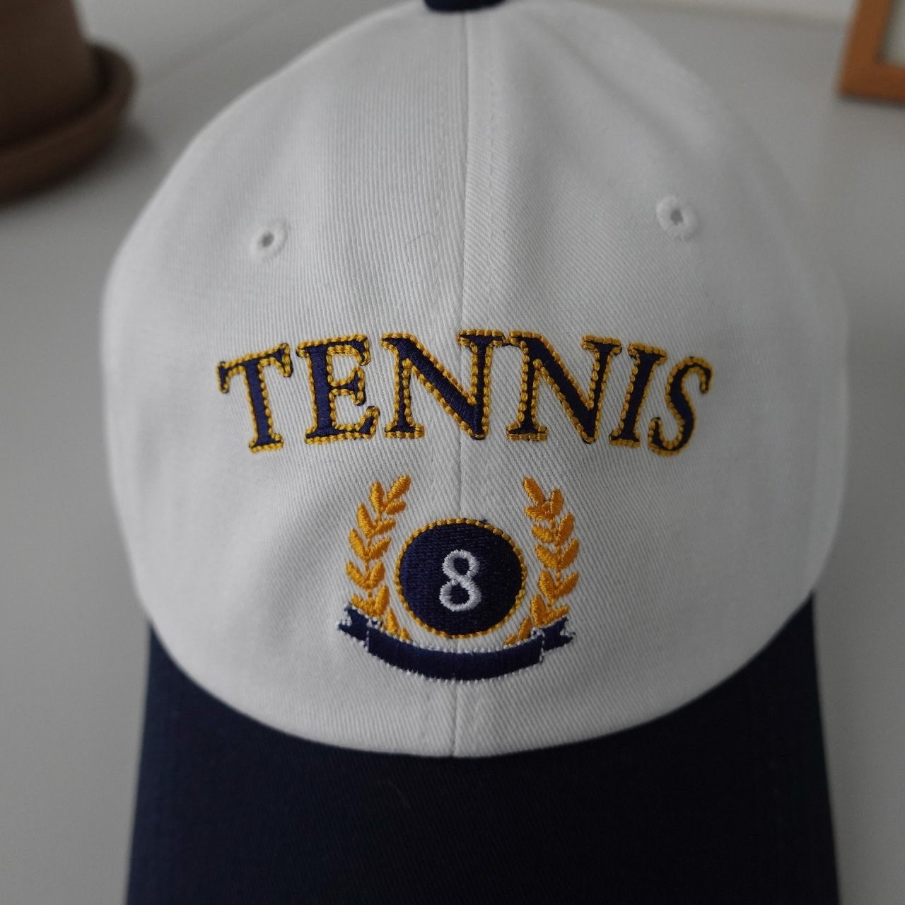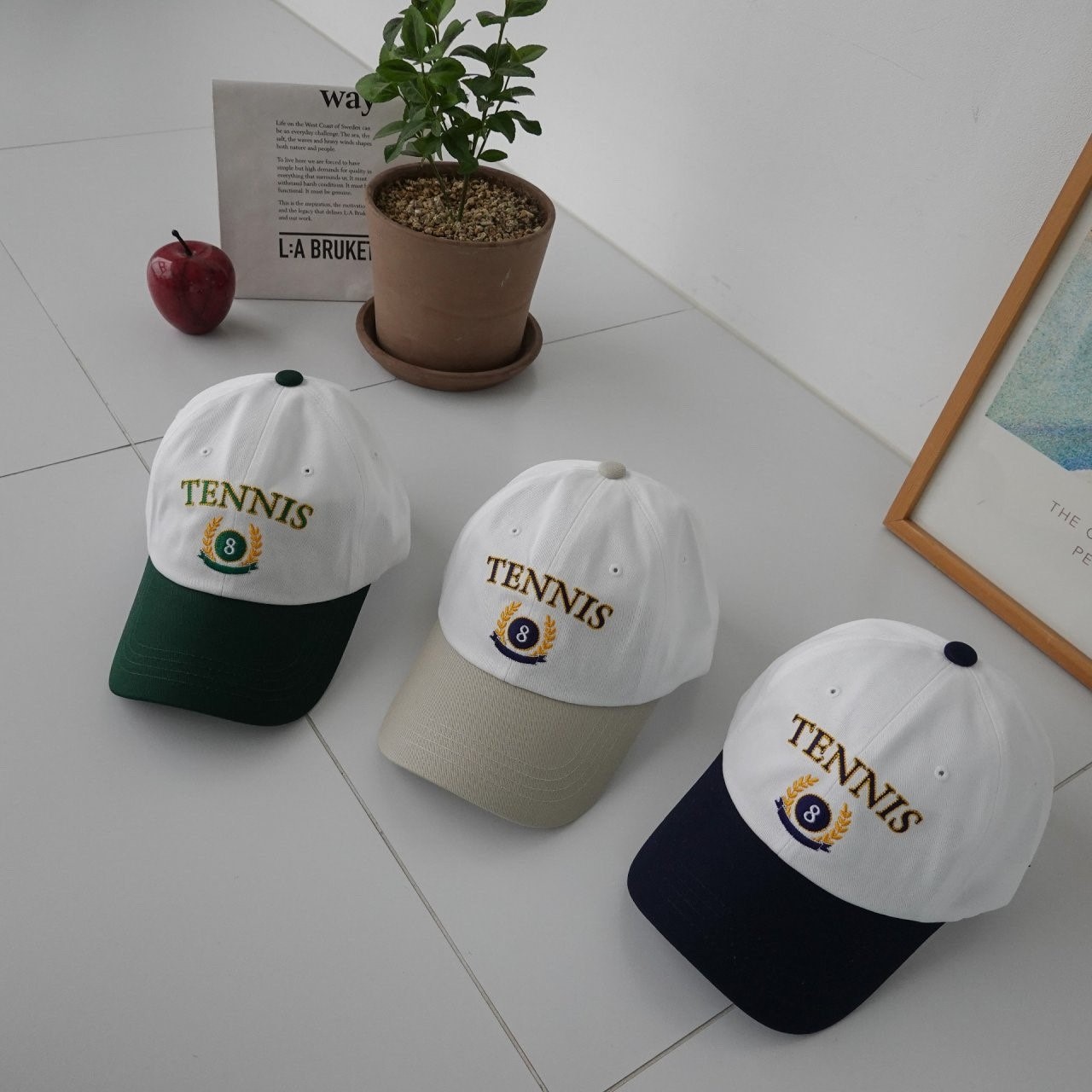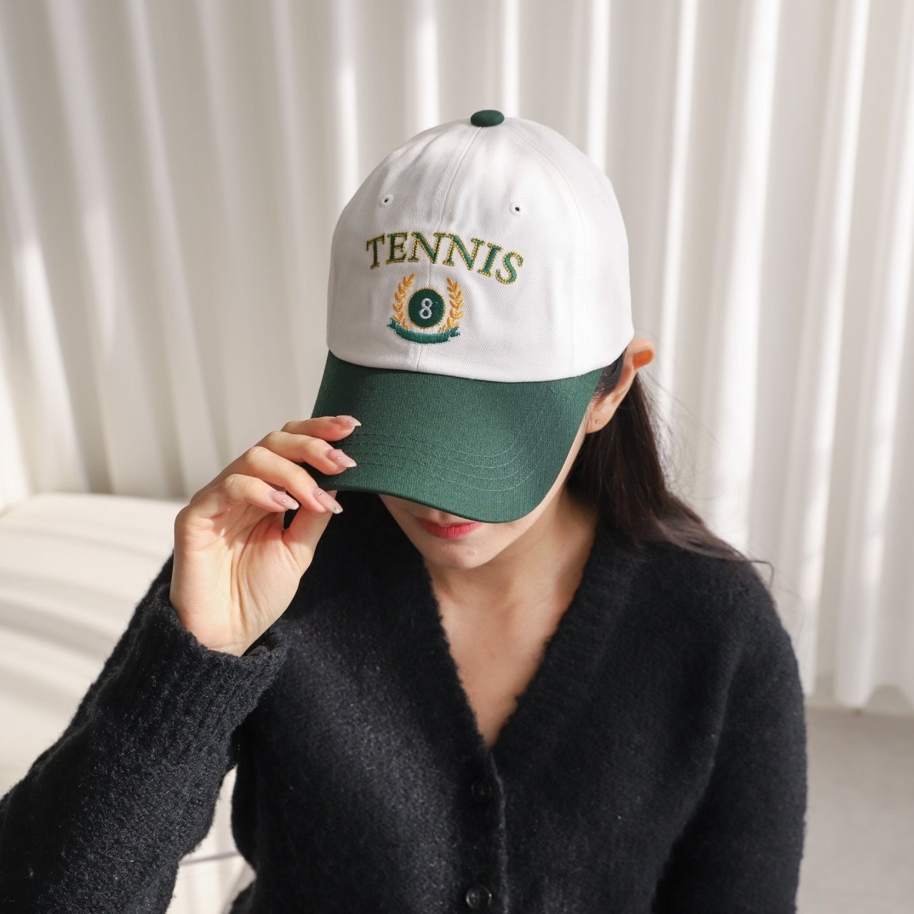 品名:BC1118 테니스 월계관 볼캡 ◎※☞颜色:그린, 네이비, 베이지 ◎※☞尺寸:F ◎※☞材质:纯棉 100% 翻译