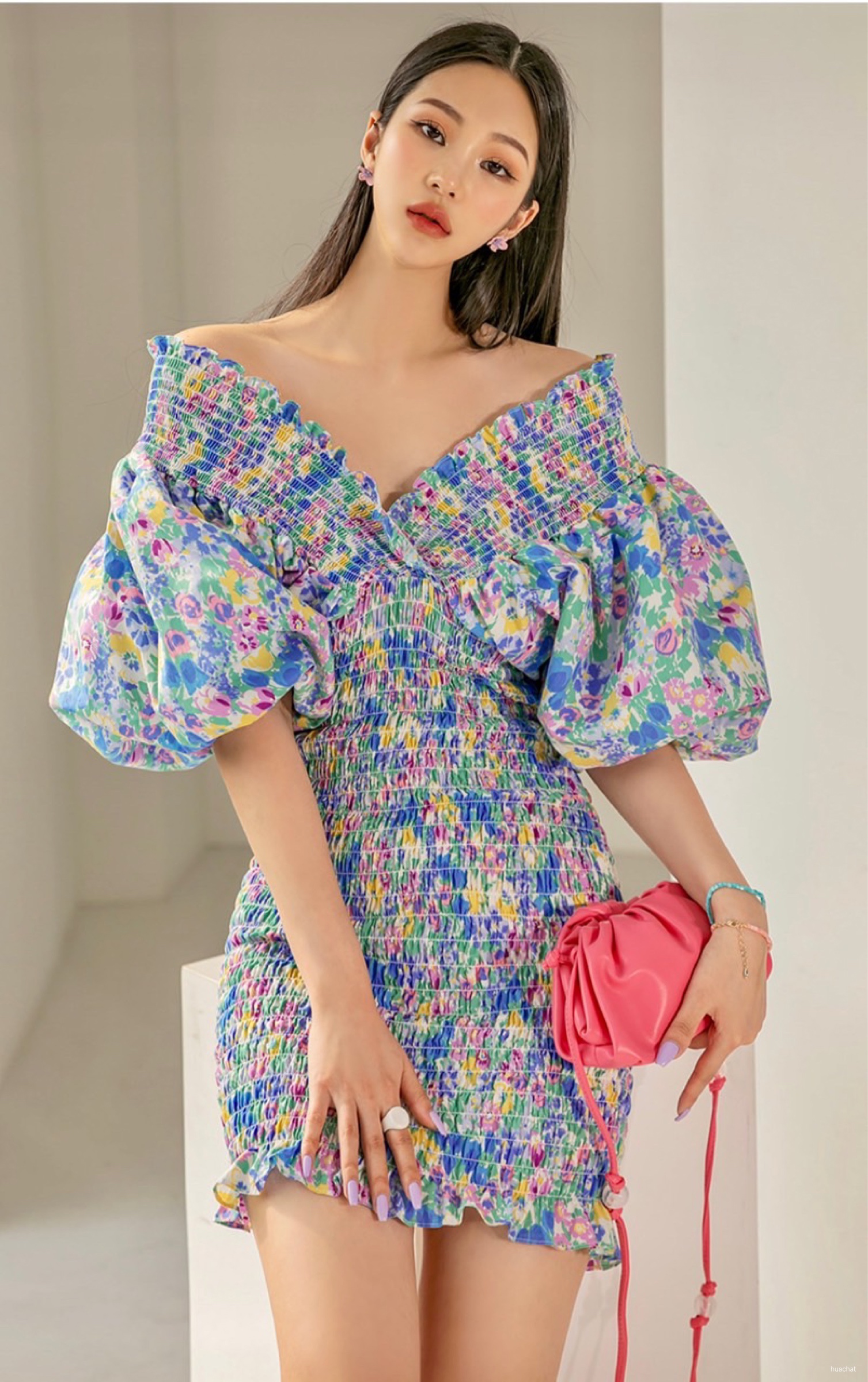 裙子身大面积的松紧褶纹设计,包容更多样的身材,也让碎花图案更迷离,过目不忘。