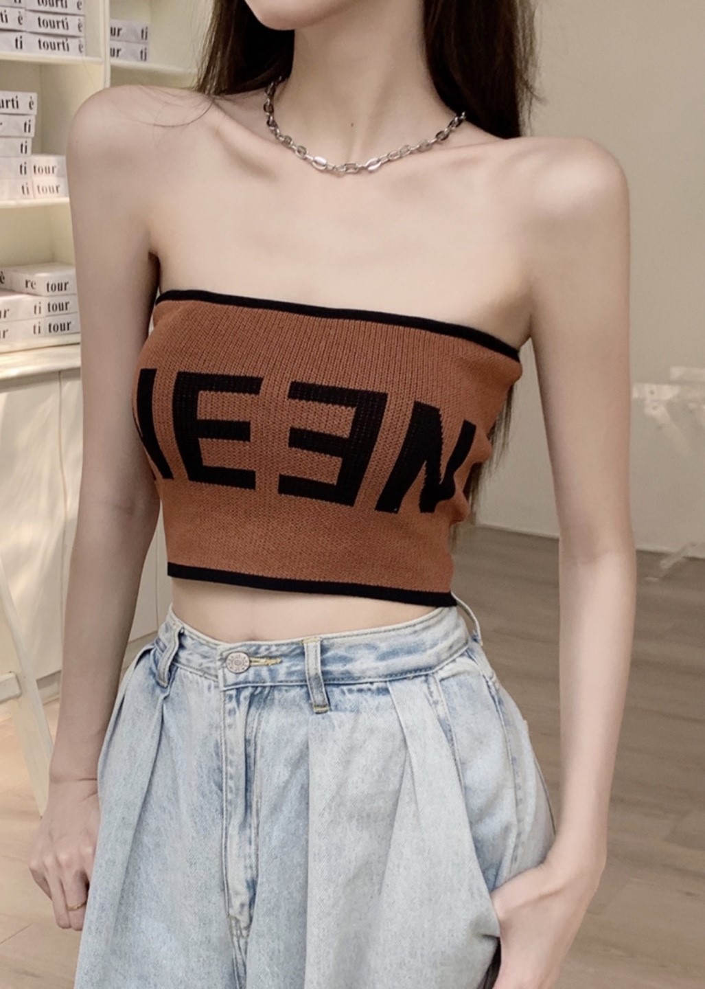 品名:세일 영문배색브라탑 ◎※☞颜色:브라운, 블랙, 아이보리 ◎※☞尺寸:FREE ◎※☞材质:聚酯 100% 翻译