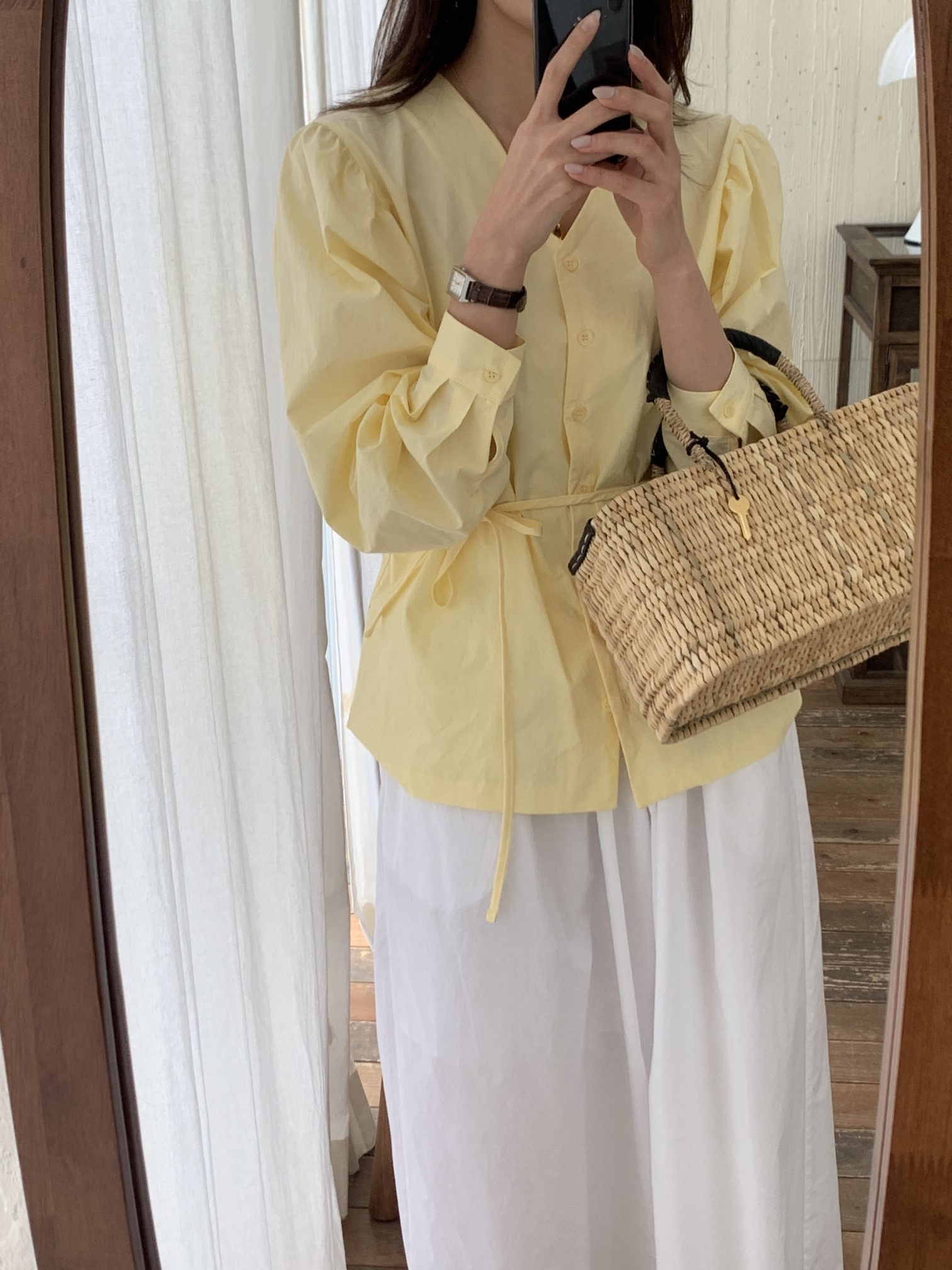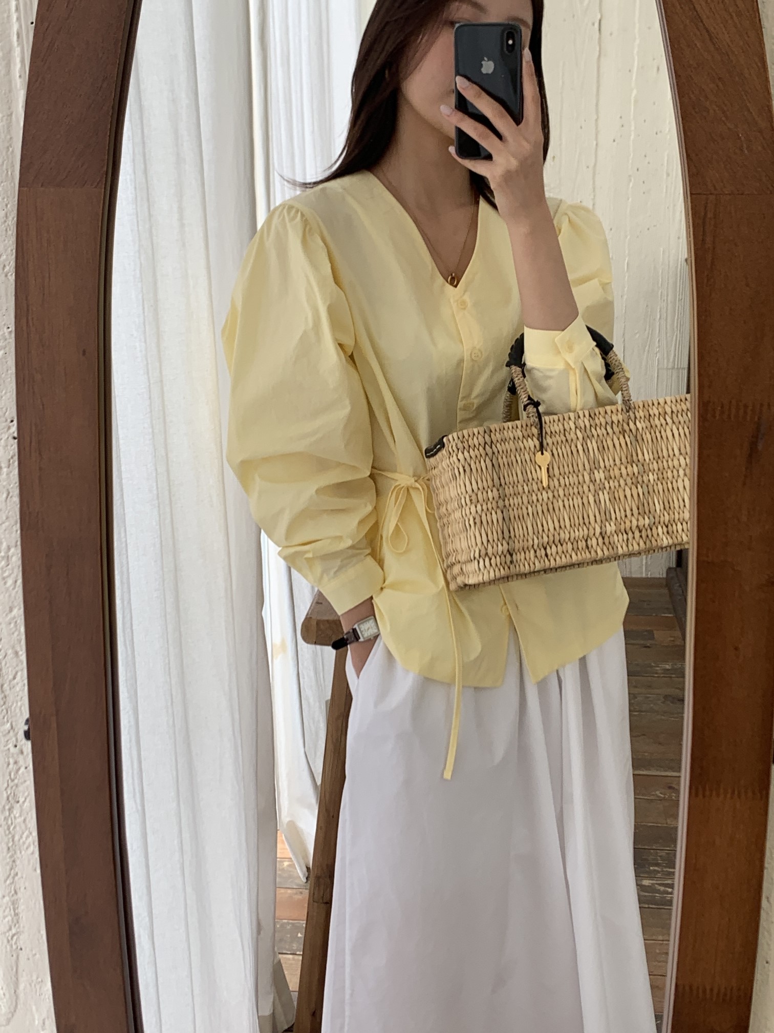 品名:아코블라우스 ◎※☞颜色:노랑, 아이보리 ◎※☞尺寸:FREE ◎※☞材质:纯棉 100% 翻译