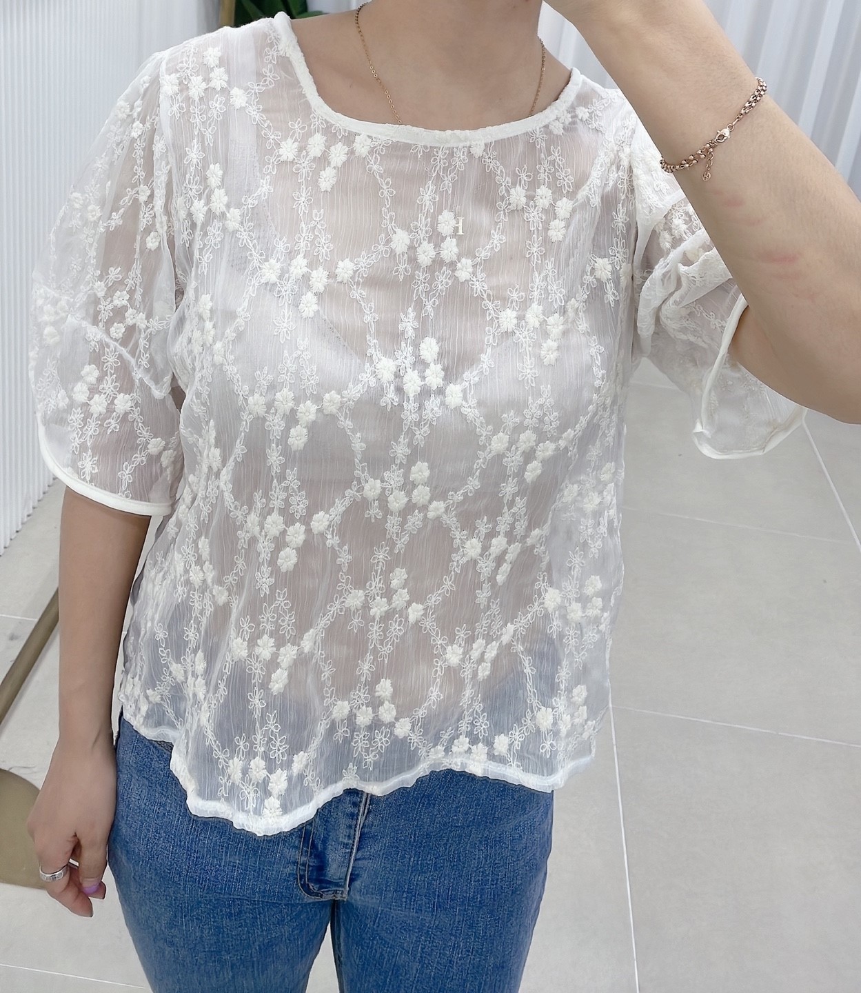 品名:세일 시스루레이스블라우스 ◎※☞颜色:베이지, 화이트 ◎※☞尺寸:FREE ◎※☞材质:聚酯 100% 翻译