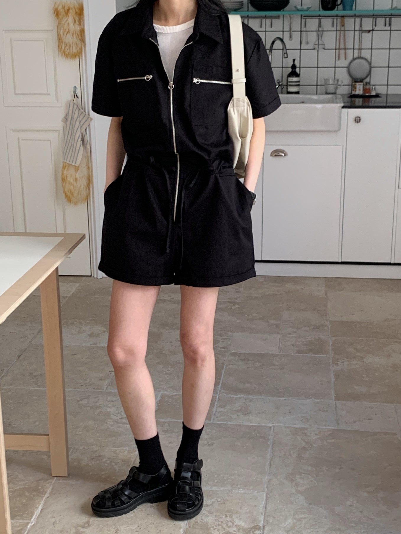 品名:M4) 몬드 점프수트 ◎※☞颜色:베이지, 블랙 ◎※☞尺寸:FREE ◎※☞材质:纯棉 100% ◎※☞注意事项:只能干洗,只能手洗,不能手洗,机洗,不能使用漂白剂,不能烘干,不能熨烫,不能曲折 翻译