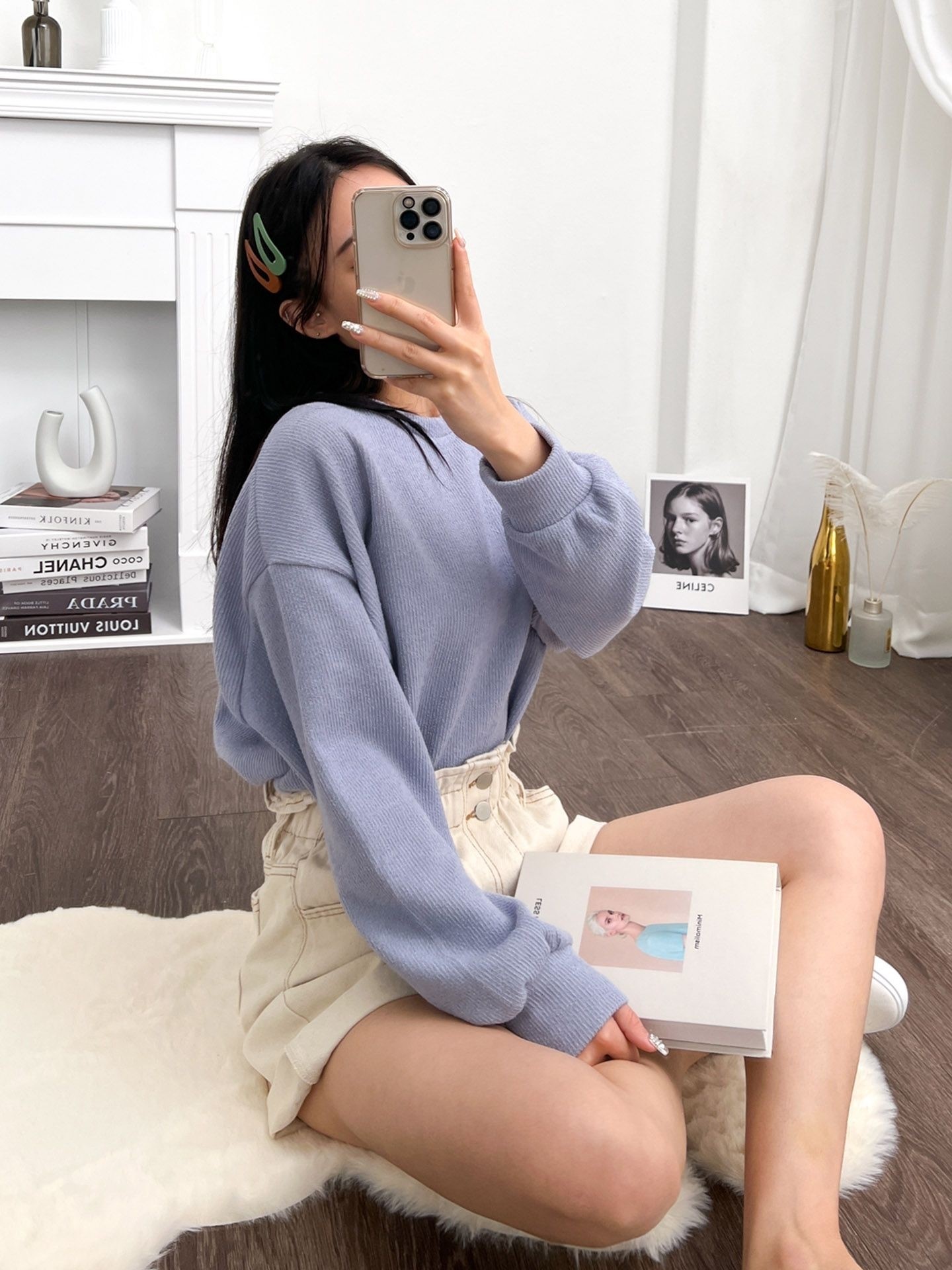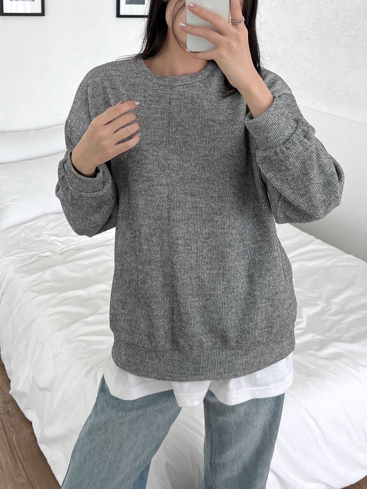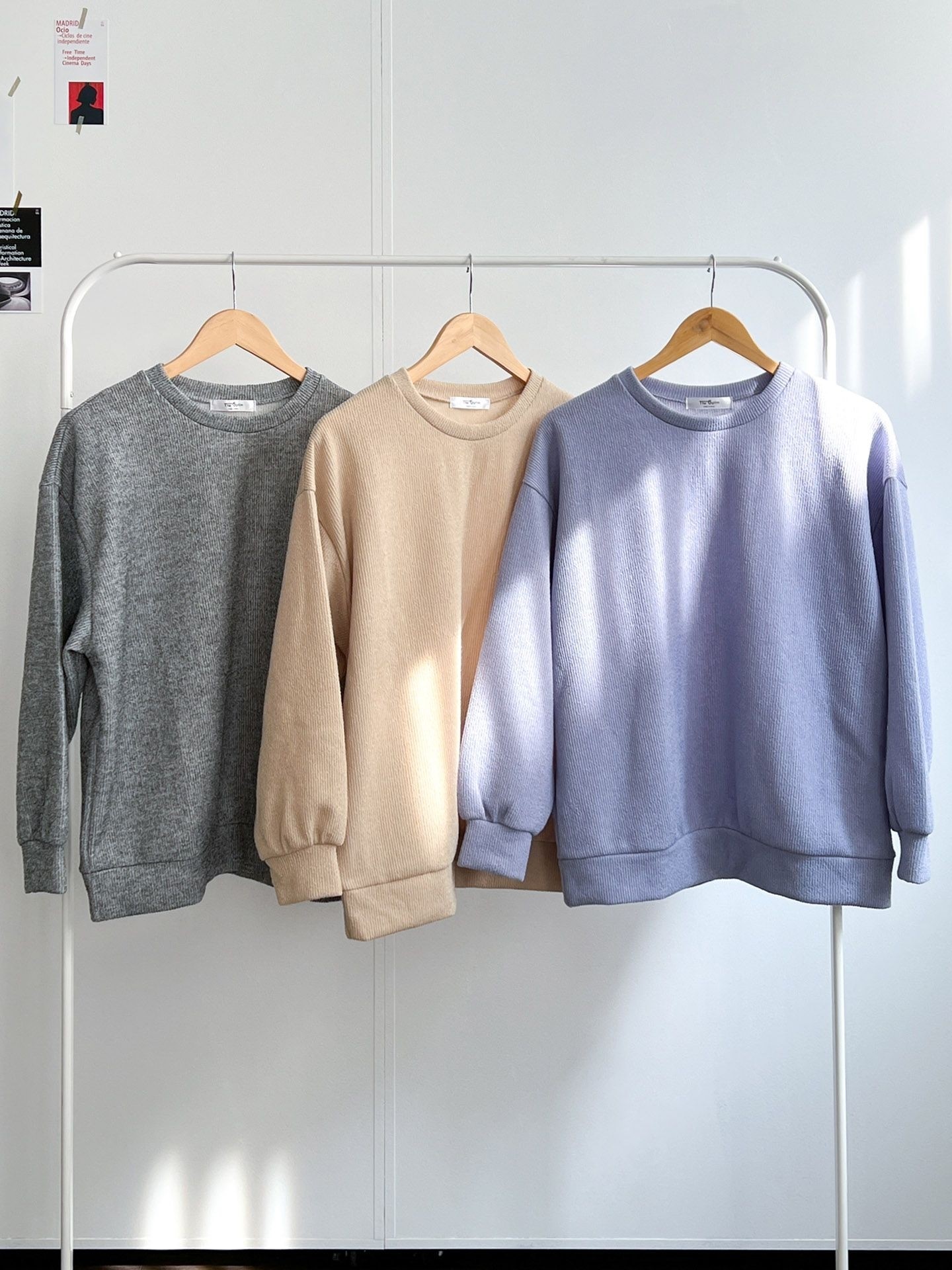 品名:纯色简约圆领套头卫衣 ◎※☞颜色:그레이, 소라, 연베이지 ◎※☞尺寸:FREE ◎※☞材质:弹力 5%,聚酯 95% 翻译