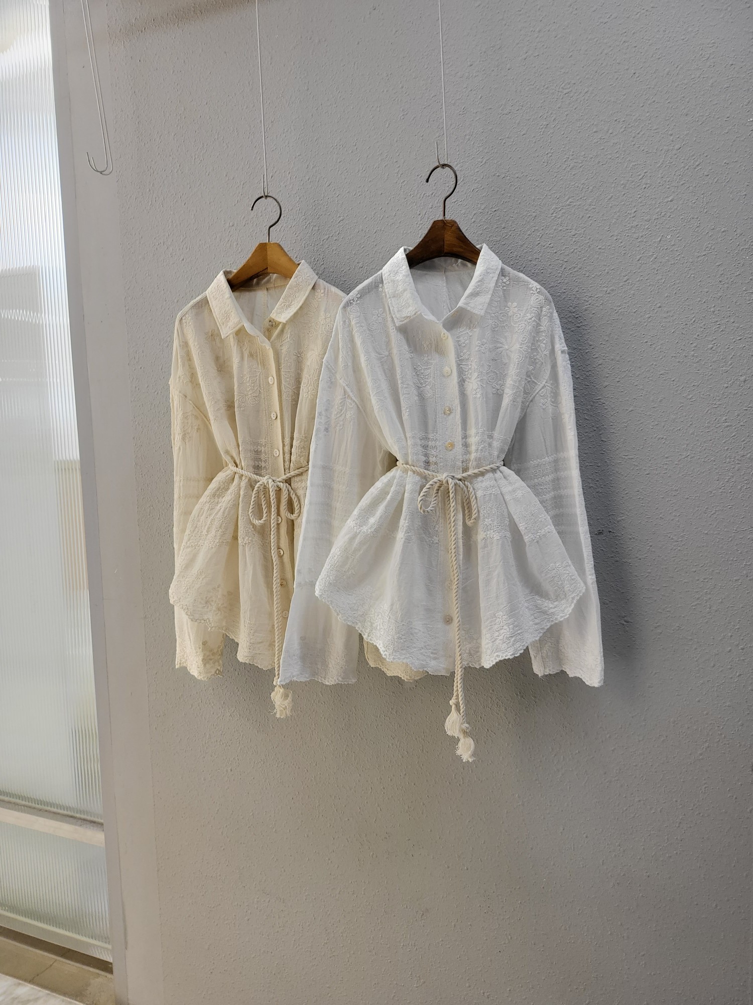 品名:모던 자수 벨트 남방 블라우스 sale ◎※☞颜色:아이보리, 화이트 ◎※☞尺寸:FREE ◎※☞材质:聚酯 100% ◎※☞注意事项:只能干洗,只能手洗,不能手洗,机洗,不能使用漂白剂,不能烘干,不能熨烫,不能曲折