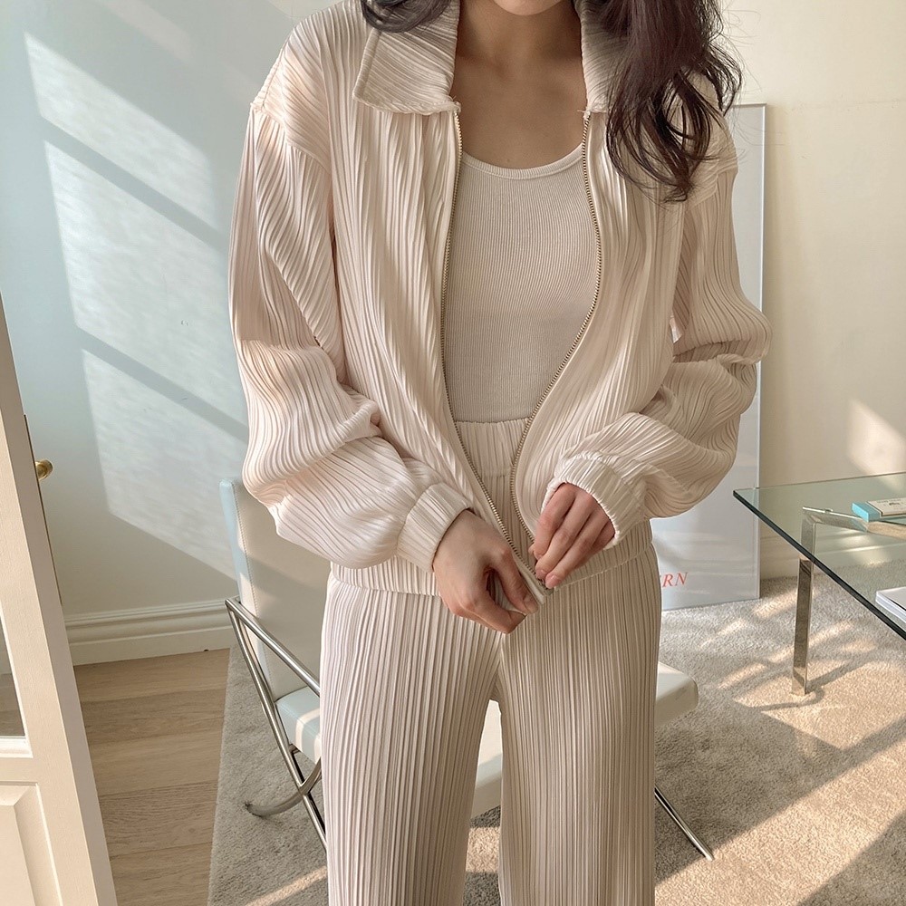 品名:O1)简约褶皱拉链翻领上衣宽松休闲裤set ◎※☞颜色:민트, 블랙, 아이보리 ◎※☞尺寸:FREE ◎※☞材质:聚酯 100% ◎※☞注意事项:只能干洗,只能手洗,不能手洗,机洗,不能使用漂白剂,不能烘干,不能熨烫,不能曲折