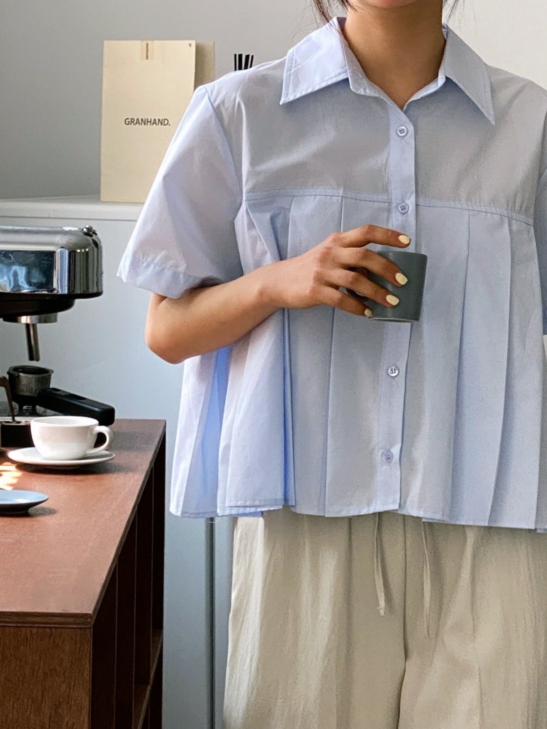 品名:简约纯色百褶纯棉短袖衬衫 ◎※☞颜色:블루, 화이트 ◎※☞尺寸:FREE ◎※☞材质:纯棉 100% 翻译