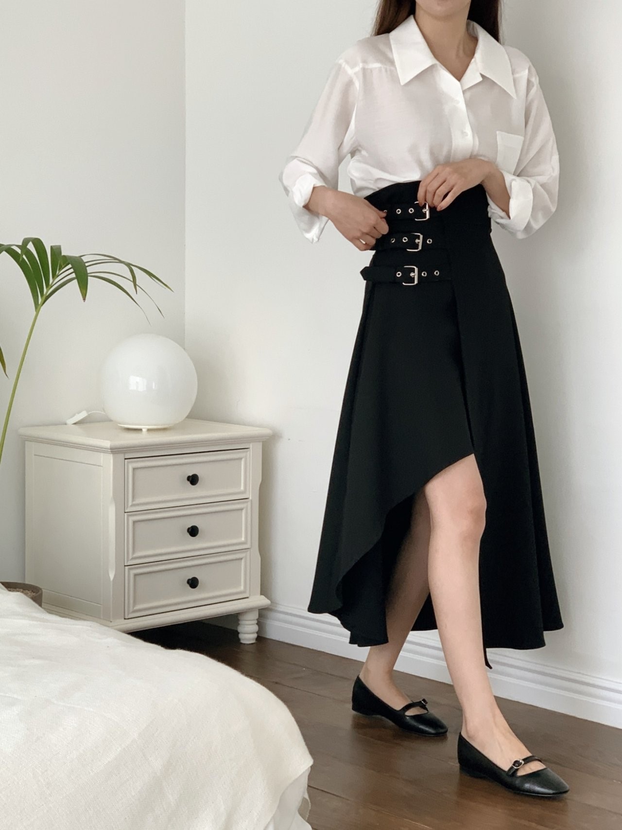 品名:버클스커트 (트임 뒷밴드 언발 롱 하이웨스트 신상) ◎※☞颜色:블랙, 차콜 ◎※☞尺寸:FREE ◎※☞材质:聚酯 100% 翻译