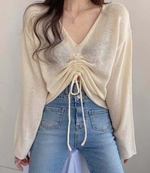 品名:브이넥스트링니트 #여성상의캐주얼시크로맨틱간절기 ◎※☞颜色:아이보리 ◎※☞尺寸:FREE ◎※☞材质:聚酯 100% 翻译