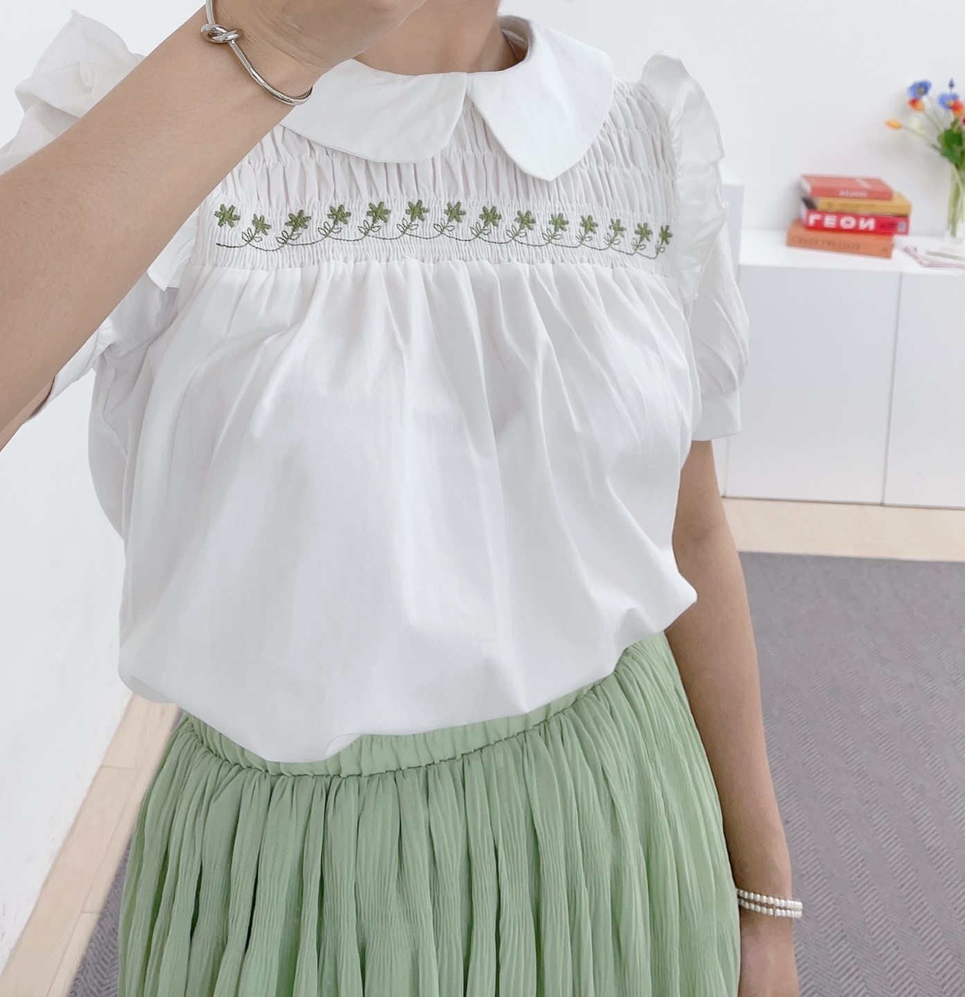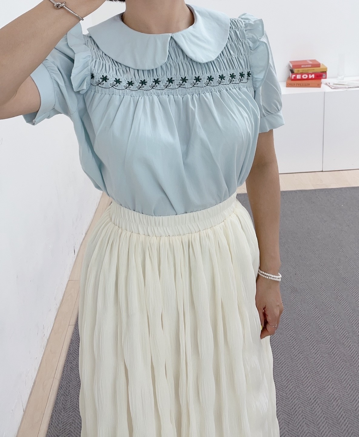 品名:자수카라블라우스 #여성상의로맨틱시크캐주얼봄여름러블리하객패션 ◎※☞颜色:소라, 화이트 ◎※☞尺寸:FREE ◎※☞材质:纯棉 100% 翻译