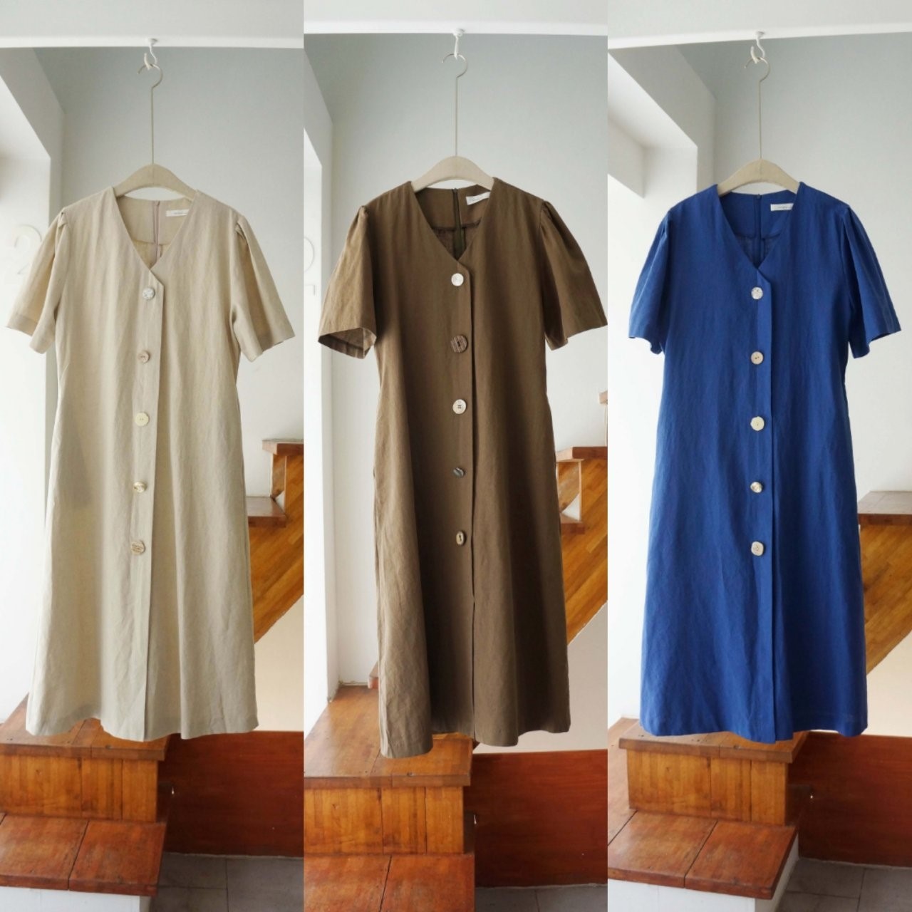 品名:A1)뉴단추OPS #봄신상 ◎※☞颜色:마베지, 브라운, 블루 ◎※☞尺寸:FREE ◎※☞材质:纯棉 45%,亚麻 55% 翻译
