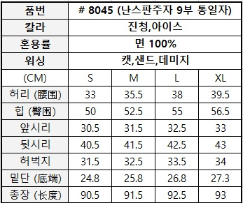 品名:8045 밴딩 린넨 난스판 9부 통바지 부들 시원 청바지 팬츠 pt ◎※☞颜色:아이스, 진청 ◎※☞尺寸:L, M, S, XL ◎※☞材质:纯棉 100% ◎※☞注意事项:只能干洗,只能手洗,不能手洗,机洗,不能使用漂白剂,不能烘干,不能熨烫,不能曲折
