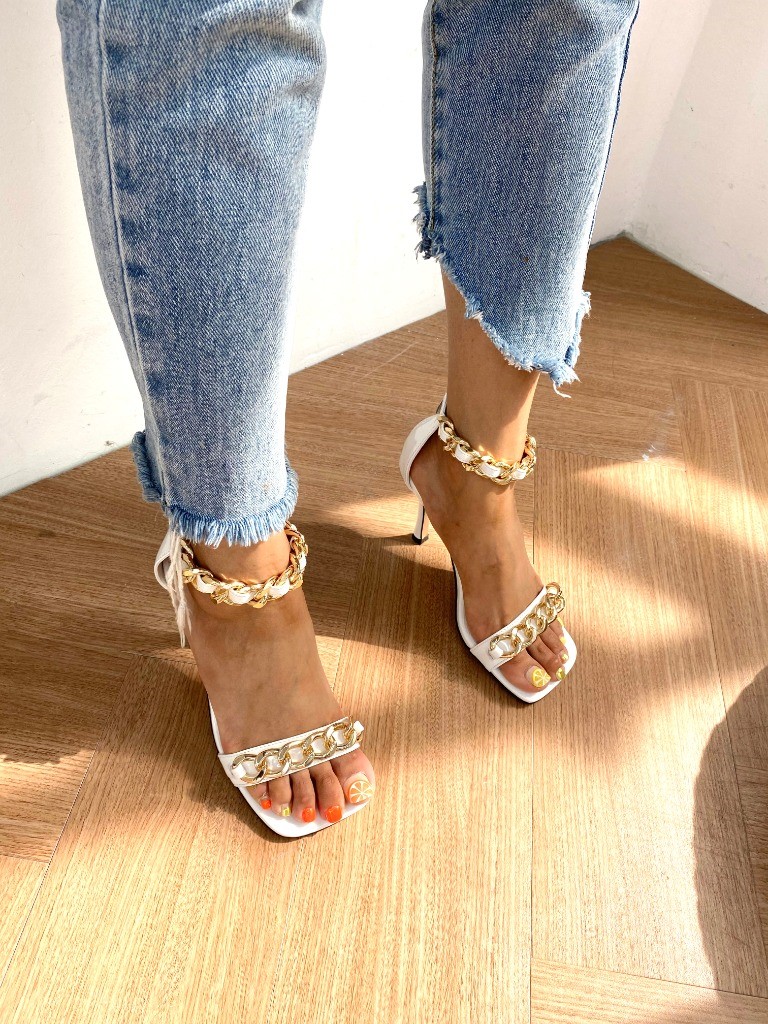 品名:1044 8.5cm피치 골드체인 샌들 ◎※☞颜色:블랙, 화이트 ◎※☞尺寸:225, 230, 235, 240, 245, 250 ◎※☞材质:合成皮革 0% 翻译