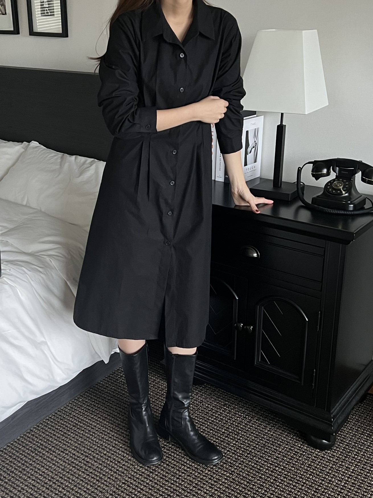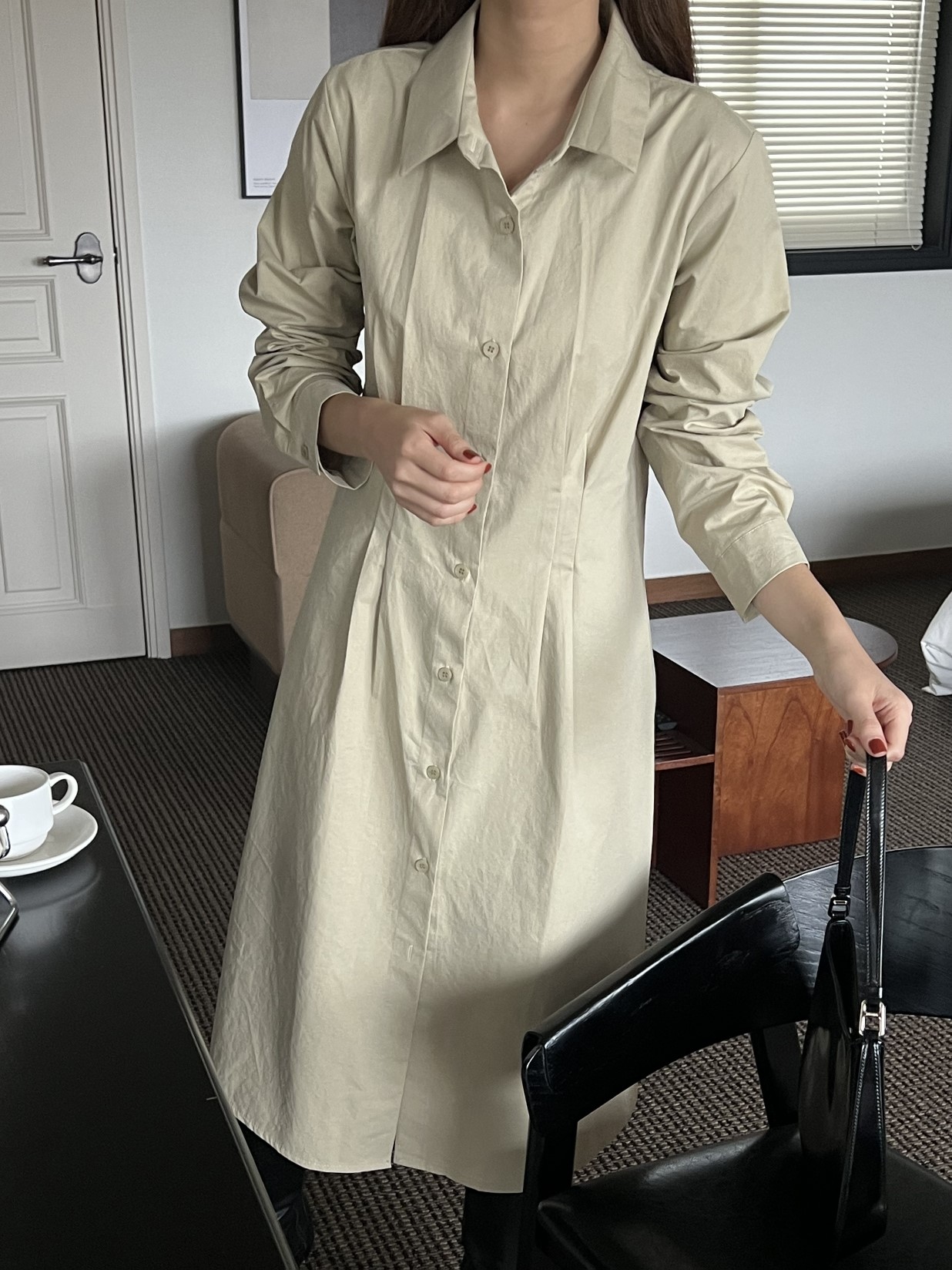 品名:时尚纯棉收腰褶皱衬衫连衣裙 ◎※☞颜色:베이지, 블랙 ◎※☞尺寸:FREE ◎※☞材质:纯棉 100% ◎※☞注意事项:只能干洗,只能手洗,不能手洗,机洗,不能使用漂白剂,不能烘干,不能熨烫,不能曲折 翻译
