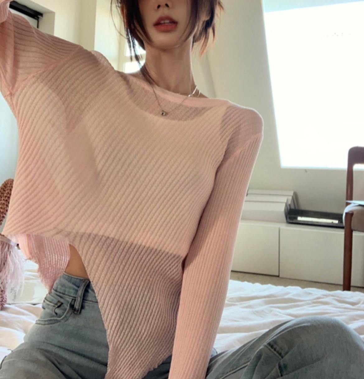 品名:시스루사선니트 #여성상의캐주얼시크섹시로맨틱간절기봄여름비치이너 ◎※☞颜色:블랙, 아이보리, 핑크 ◎※☞尺寸:FREE ◎※☞材质:聚酯 100% 翻译