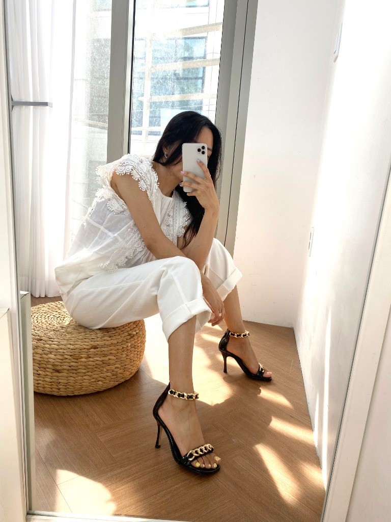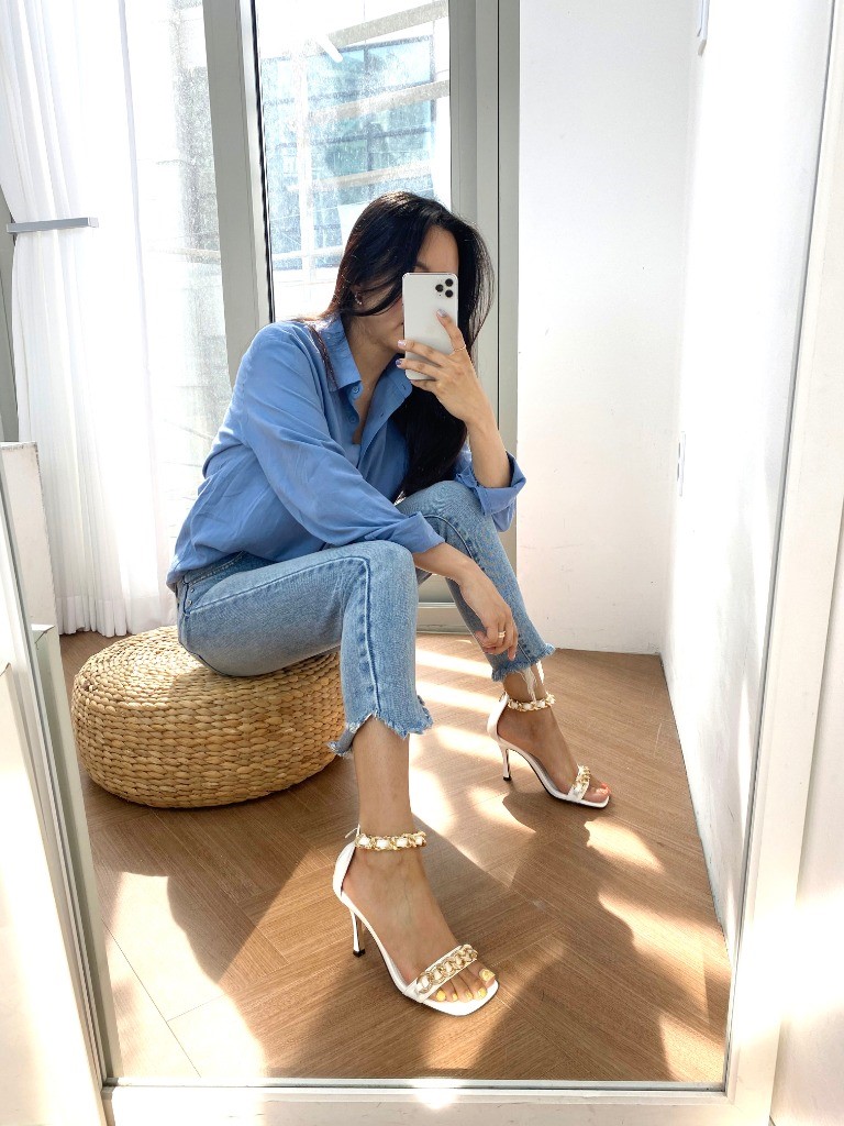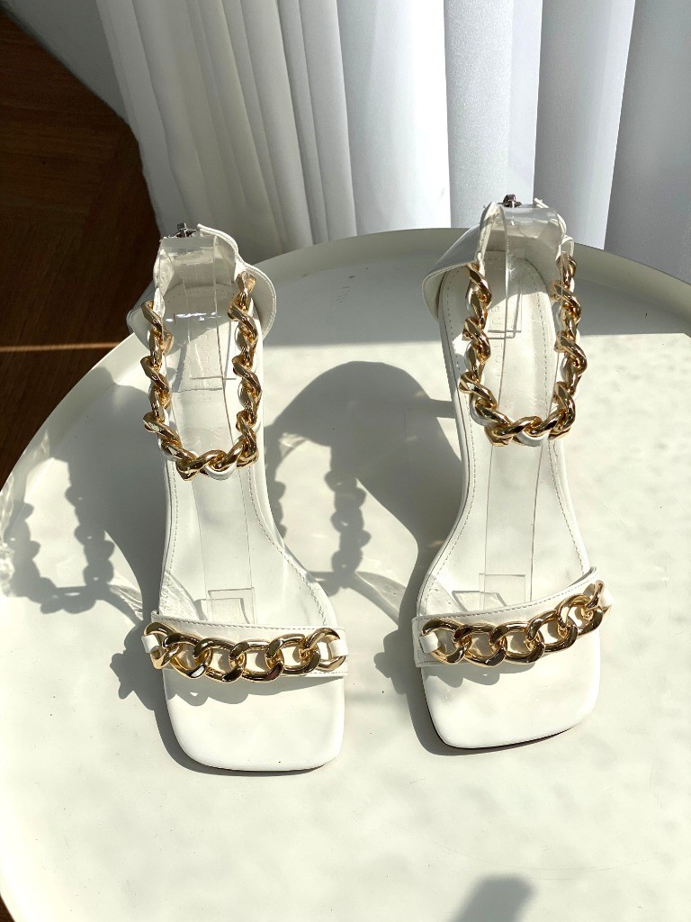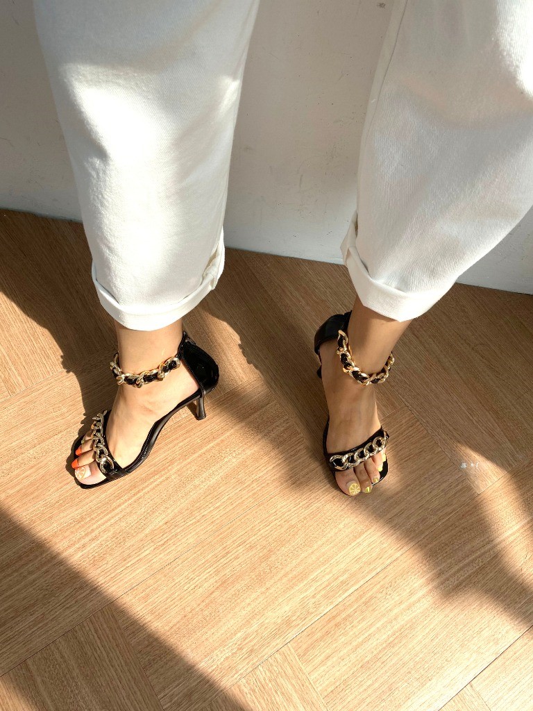 品名:1044 8.5cm피치 골드체인 샌들 ◎※☞颜色:블랙, 화이트 ◎※☞尺寸:225, 230, 235, 240, 245, 250 ◎※☞材质:合成皮革 0% 翻译