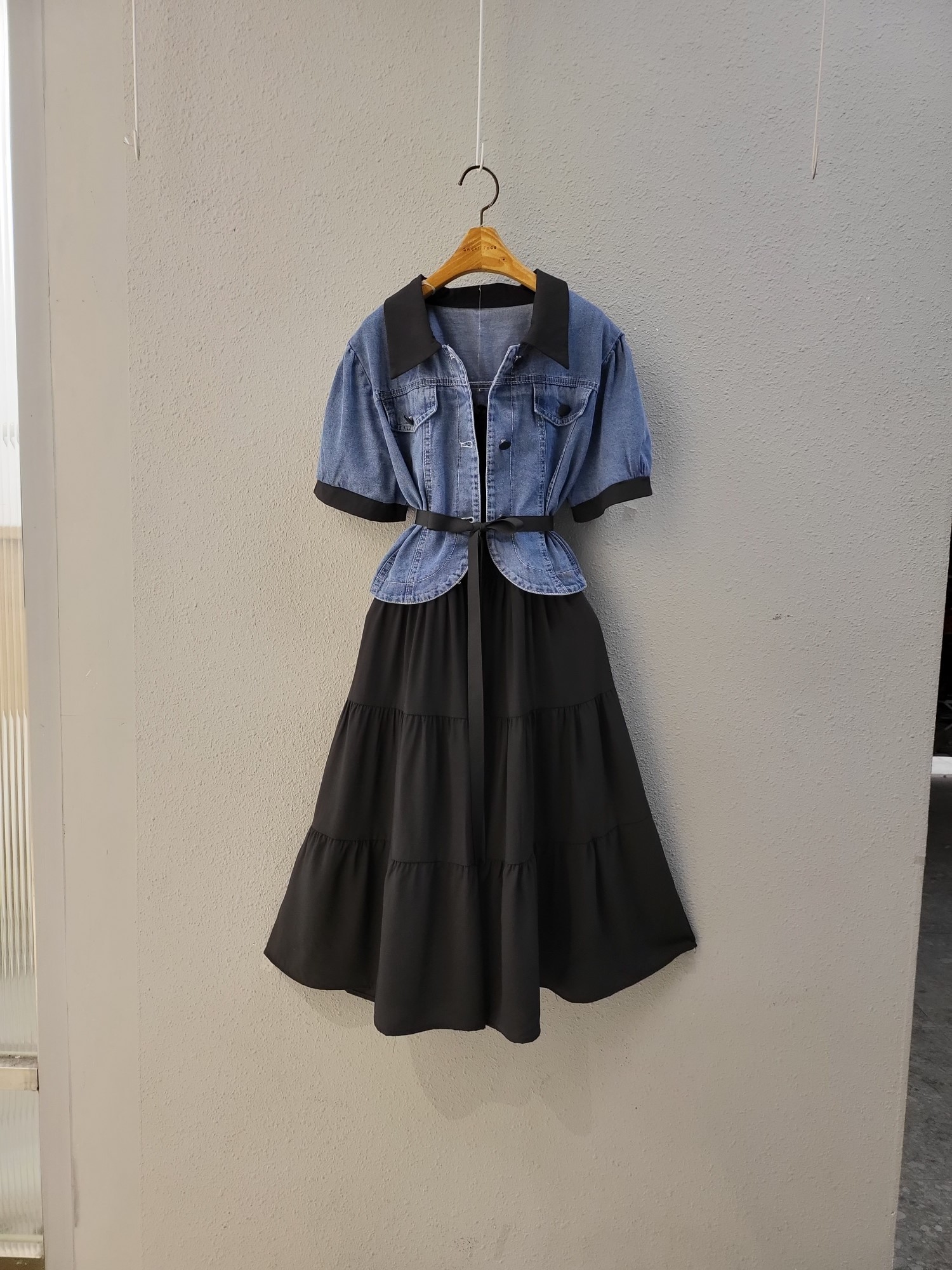 品名:배색 데님 자켓 스모크 셔링 원피스 세트 ◎※☞颜色:블랙 ◎※☞尺寸:FREE ◎※☞材质:纯棉 100% 翻译